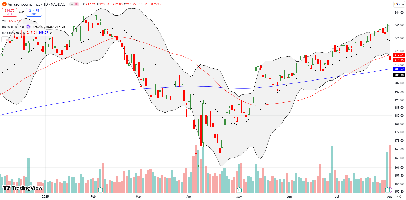 Technical status: I observed Amazon break decisively below its 50DMA post‑earnings, falling over 8% with 200DMA support waiting below.