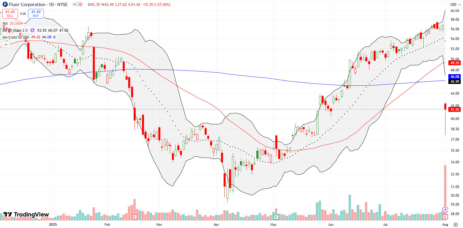 Fluor Corp (FLR) crashed post-earnings below all of its support, dropping by 27% and losing a large share of its gains since the April lows.