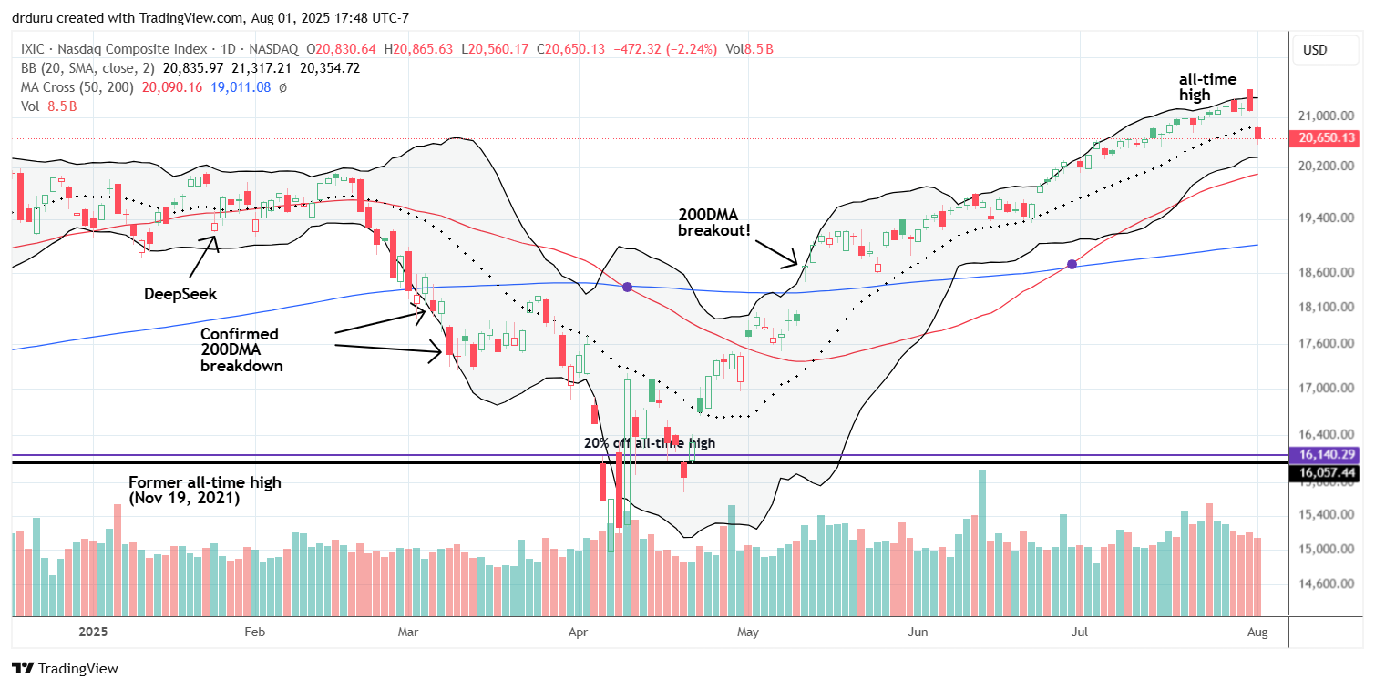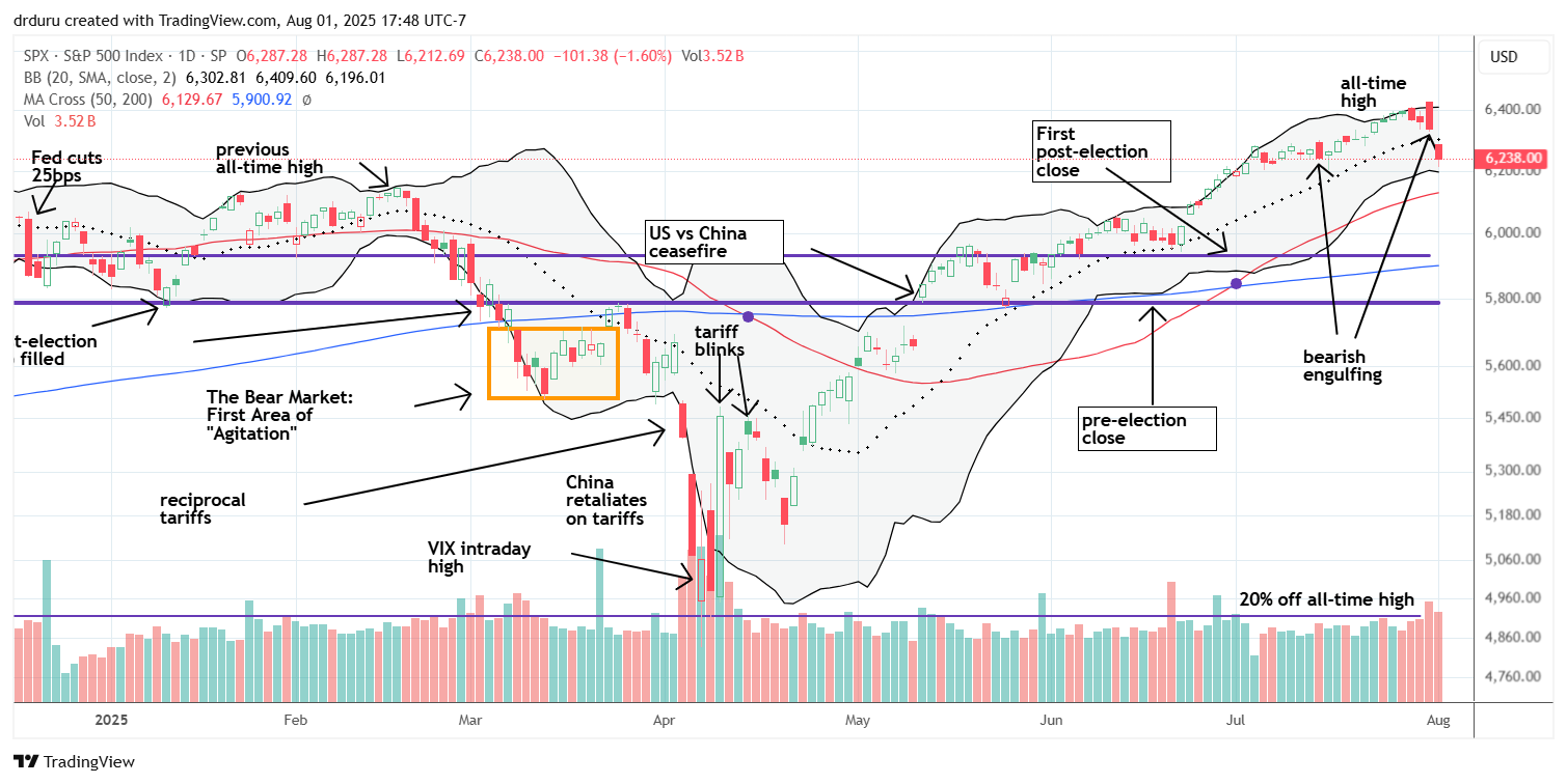 Finally the bears break in on all the fun the bulls have had for months. The stock market got overwhelmed with a flood of bad news that was just too difficult to ignore or look through (for now). The July jobs report was not just weak but also it included a massive and historic downward revision: “Revisions for May and June were larger than normal. The change in total nonfarm payroll employment for May was revised down by 125,000, from +144,000 to +19,000, and the change for June was revised down by 133,000, from +147,000 to +14,000.” Suddenly, the economy looks a lot weaker, and the pressure will increase on the Fed to lower interest rates despite mounting inflationary pressures from tariffs.