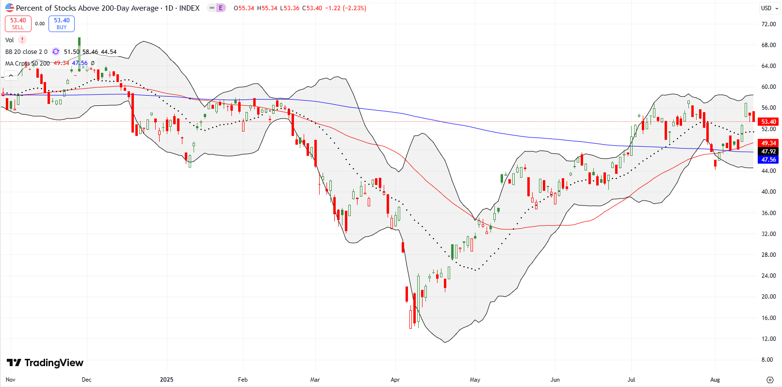 “Above the 50” (AT50) uses the percentage of stocks trading above their respective 50-day moving averages (DMAs) to measure breadth in the stock market. Breadth defines the distribution of participation in a rally or sell-off. As a result, AT50 identifies extremes in market sentiment that are likely to reverse. Above the 50 is my alternative name for “MMFI” which is a symbol TradingView.com and other chart vendors use for this breadth indicator. Learn more about AT50 on my Market Breadth Resource Page. AT200, or MMTH, measures the percentage of stocks trading above their respective 200DMAs.