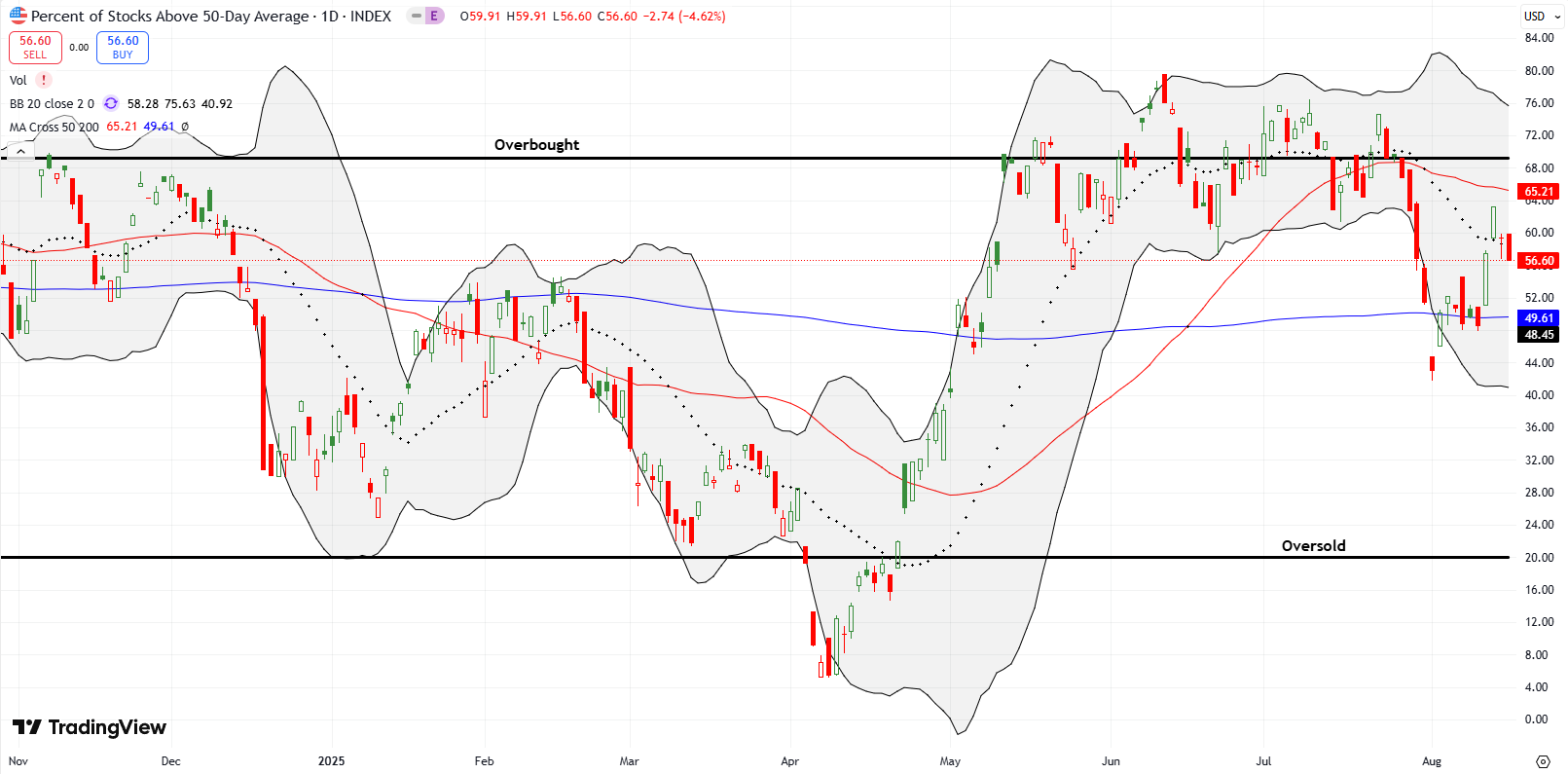 • AT50 (MMFI) = 56.6% of stocks are trading above their respective 50-day moving averages (first overbought day)