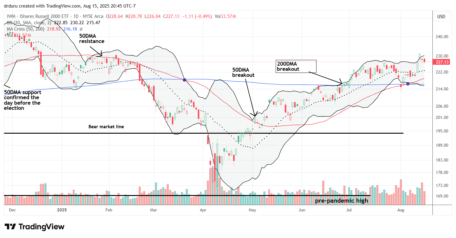 IWM was the biggest beneficiary of the breadth surge, breaking out to a new high for the year. Unfortunately, I was caught flat-footed. My regularly scheduled IWM calendar call spreads targeted the $225 strike, but IWM blew through the July highs and left me with only a fraction of the gains I could have had with straight calls. I adjusted with a new $230 strike calendar spread, and I am now carrying straight call options into next week after adding more on Friday. Of course, IWM is at risk now of a quick pullback to 20DMA support.