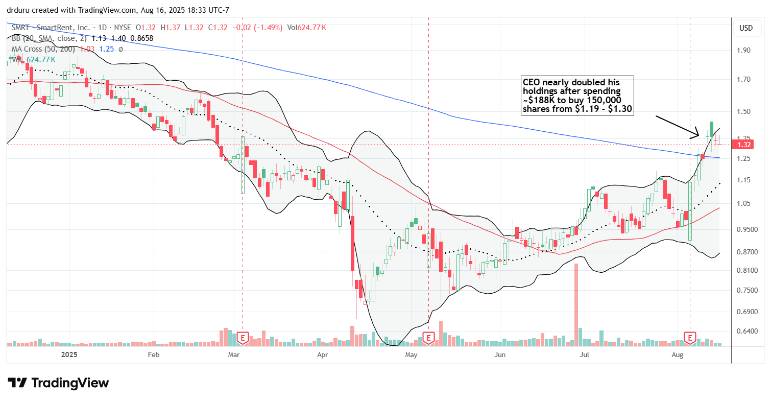 Technical status: SmartRent, Inc (SMRT) broke out above 200DMA resistance with an 8.8% gain on news of CEO buying. However, the stock has not yet confirmed the breakout with a higher close. Buyers were stymied by a fade in efforts to confirm the breakout on the next day.