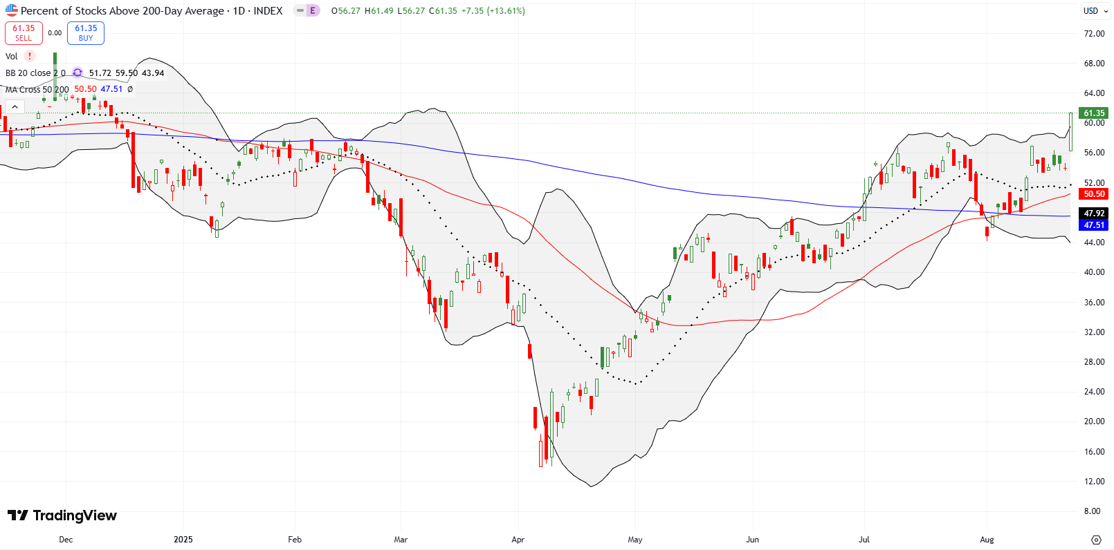 AT50 (MMFI), the percentage of stocks trading above their respective 50DMAs, closed the week just under the overbought threshold (70%). The pace and magnitude of breadth expansion stunned me, as AT50 leapt 12 percentage points for a 22% gain. This pop was almost as powerful by itself as the 2-day moving the prior week that created a revival in bullish momentum. Friday was another version of what can happen when a rally reignites.