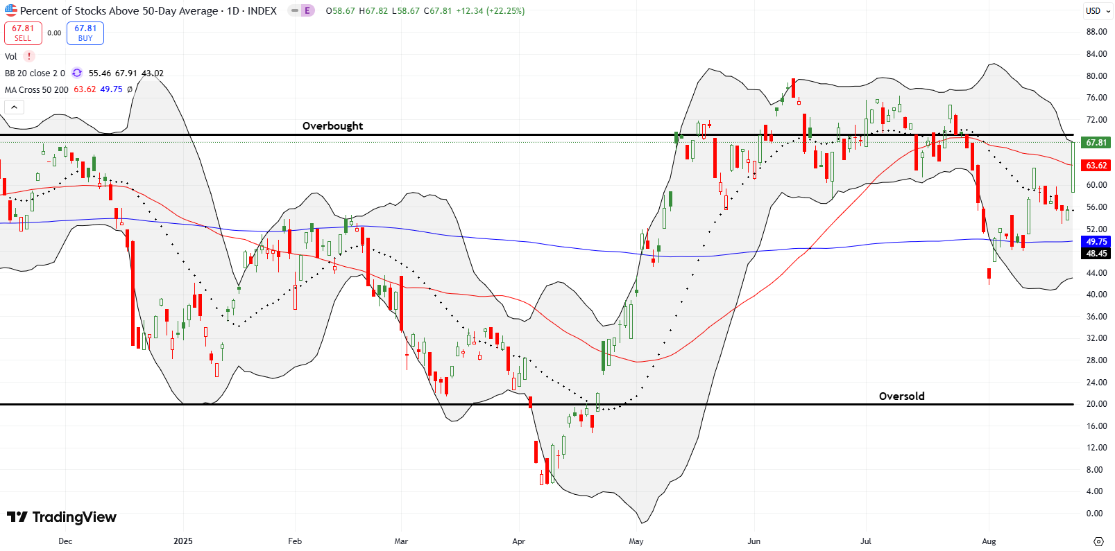 • AT50 (MMFI) = 67.8% of stocks are trading above their respective 50-day moving averages (first overbought day)