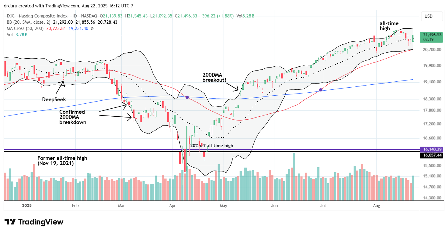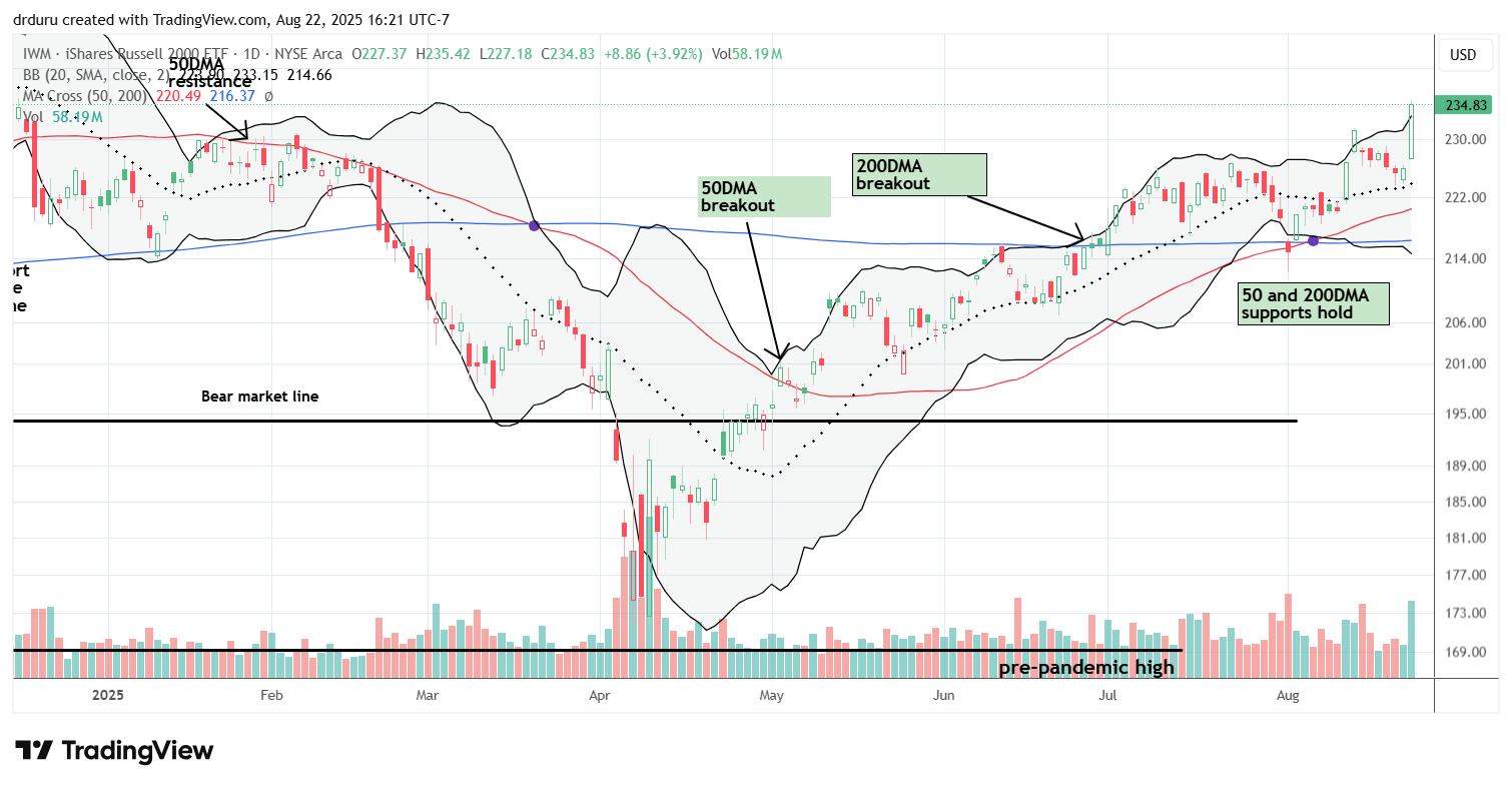 Last week delivered one of the most bullish one-day expansions of market breadth I have ever seen. On Friday, August 22nd, Federal Reserve Chair Jerome Powell spoke at the Jackson Hole confab and gave financial markets sufficiently dovish signals to reignite a rally that had waned most of the week. Big cap tech wavered the most (perhaps due to talk about an AI bubble from Sam Altman, the godfather of today’s AI), yet the market’s celebration turned its attention to the market’s laggards as well as rate sensitive stocks. SwingTradeBot confirmed the fresh bullish momentum with technical scans showing overwhelmingly positive signals, no new lows, and advancers far outpacing decliners. Even the equal weighted S&P 500, Invesco S&P 500 Equal Weight ETF (RSP), jumped 2.0% to an all-time high. RSP is like the icing on the cake as the bull market rally reignites.