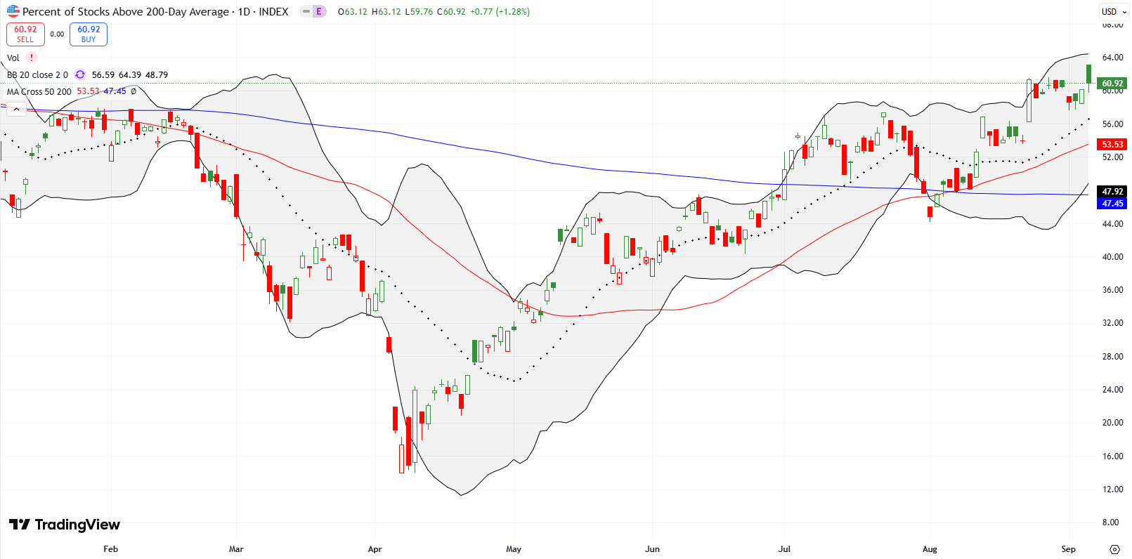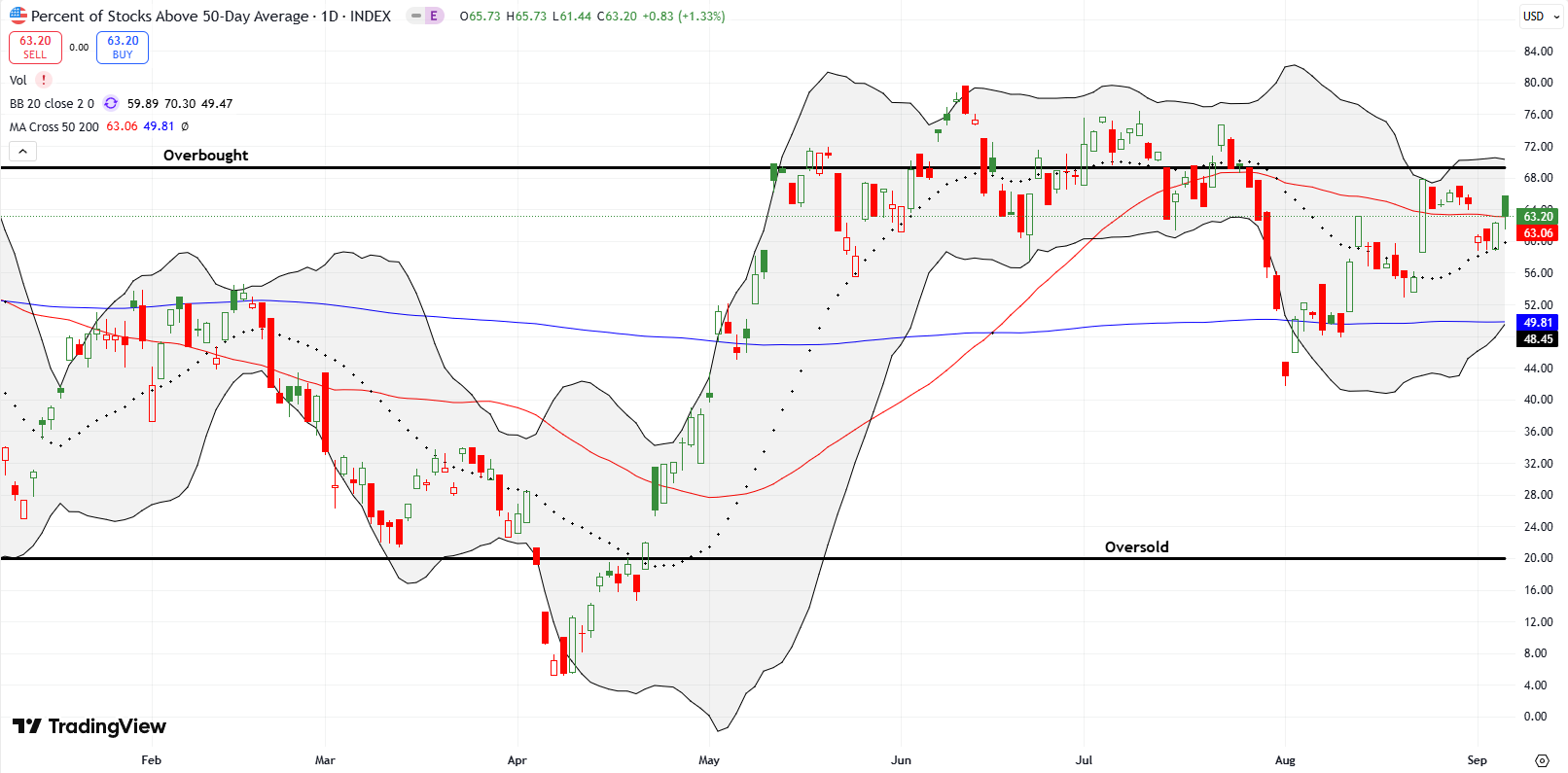 - AT50 (MMFI) = 63.2% of stocks are trading above their respective 50-day moving averages (first overbought day)