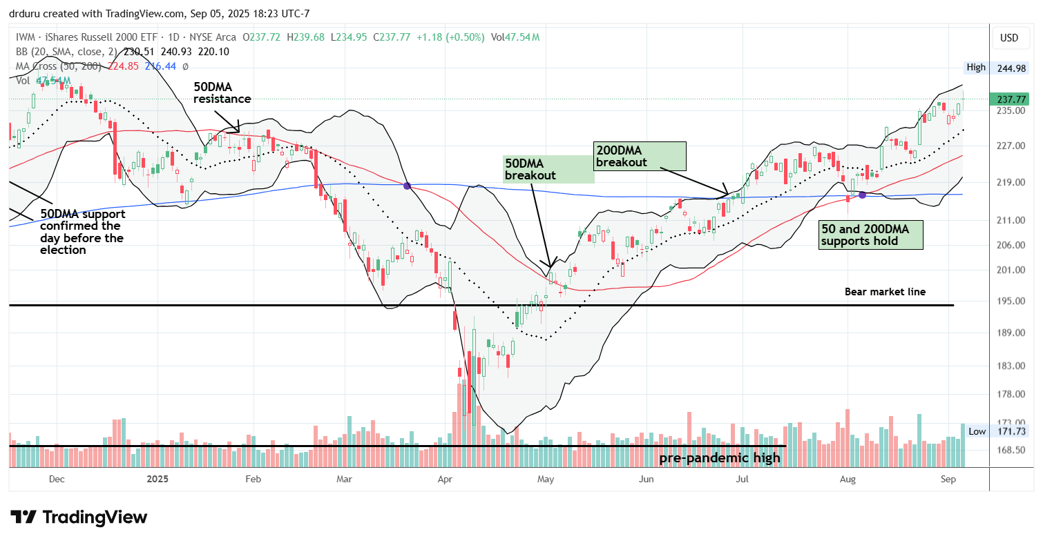 Small caps were the champs of the week. IWM closed up 0.5%, printing a new high back to December and firming its uptrend after wavering in July. In a rate-cutting cycle, the resulting financing relief should favor smaller, more speculative names, so I expect small caps to keep outperforming in a more accommodating monetary environment. I hold a substantial core IWM position I have accumulated since last year, and I carried call options into next week as I continue to trade around my core position.