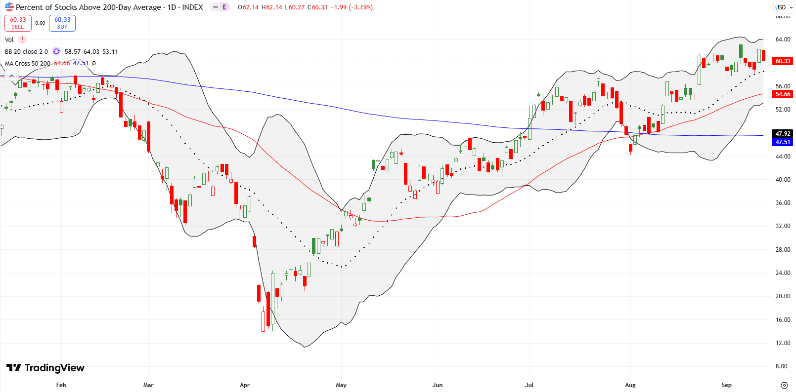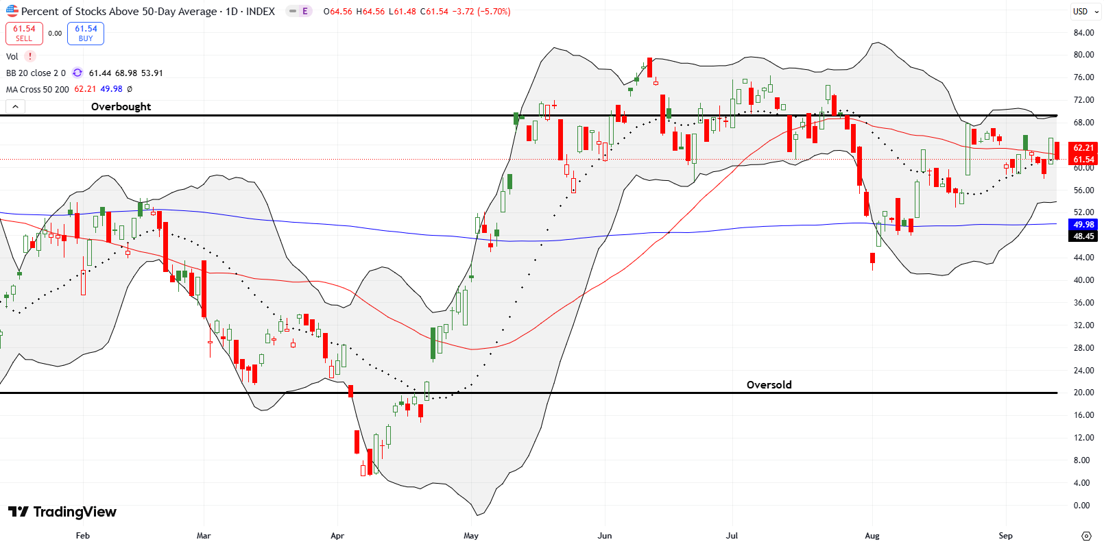 - AT50 (MMFI) = 61.5% of stocks are trading above their respective 50-day moving averages (first overbought day)