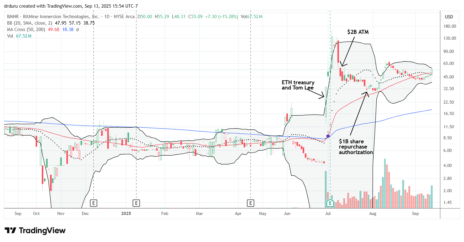 Trade commentary: When I wrote about Tom Lee and BMNR’s conversion event, I targeted a steeper pullback for buying into the hype. BMNR stopped just short of testing its 50DMA support before popping 15%. I chose not to chase the stock to my detriment. I finally bought in on BMNR’s next test of 50DMA support. After that support quickly gave way, I bought a second tranche of shares. I am now in the green with Friday’s 15.3% gain. Here is what Cathy Wood had to say about BMNR in ARK’s weekly email explaining outsized moves in the ARK portfolio: