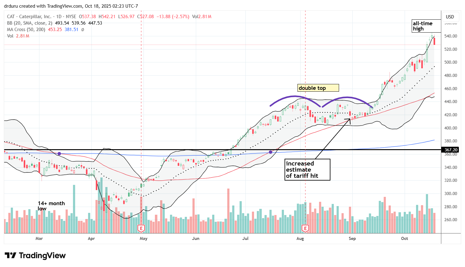 Technical status: CAT remains in a strong uptrend, defying market weakness to hit new all-time highs. Incredibly, CAT managed to translate bad news on increased tariff costs to this impressive run-up. Friday’s gap down and 2.6% loss looks like a topping pattern, but, like SLV, CAT setup a slingshot bullish trade.