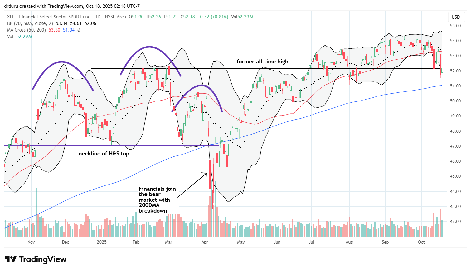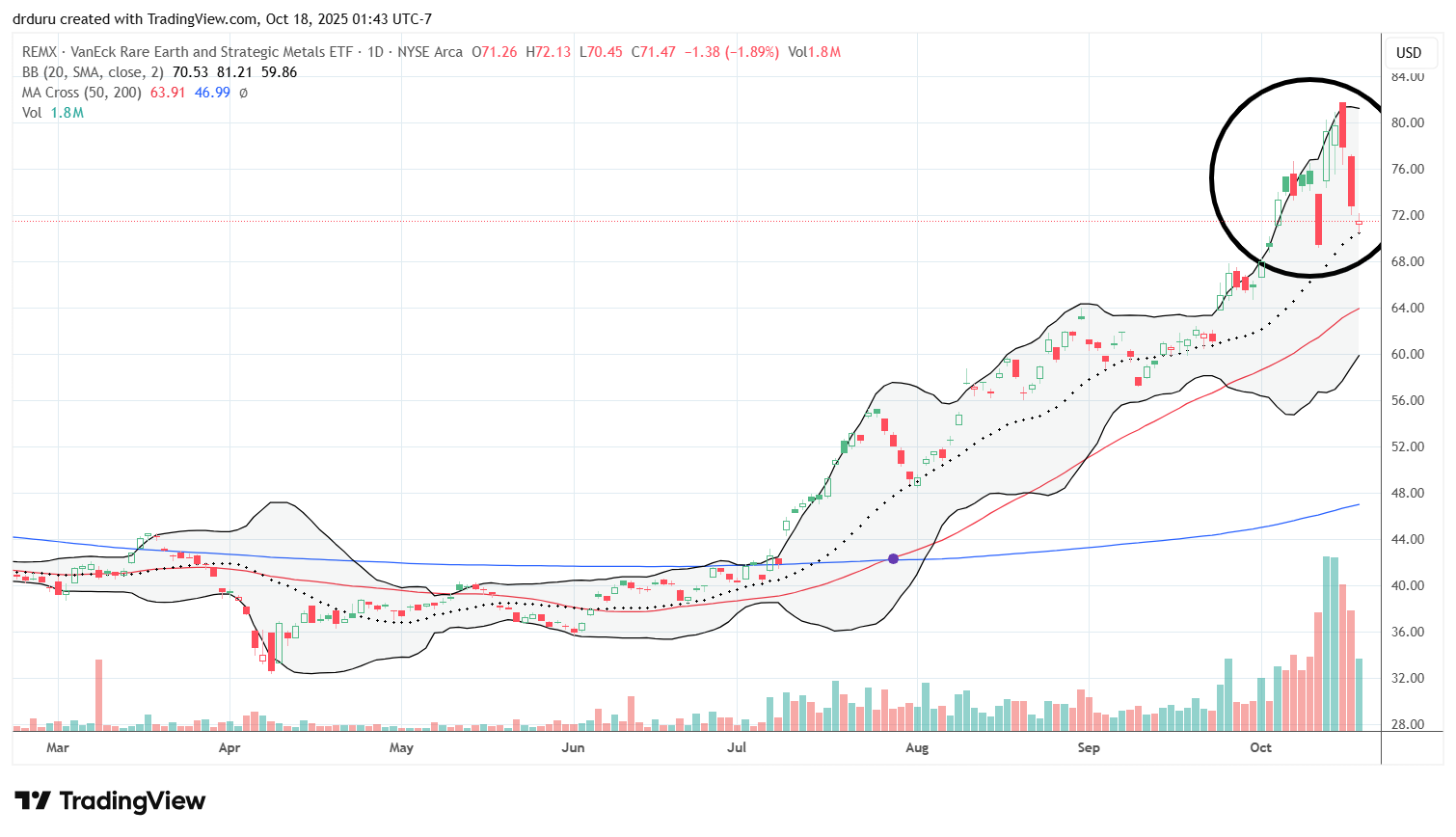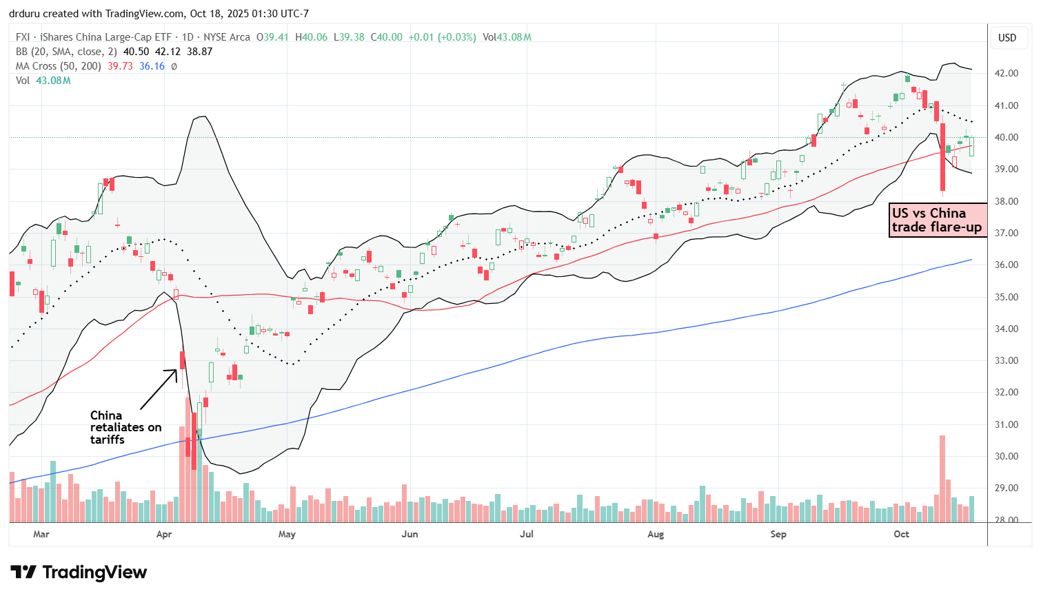 Trade commentary: I am not trading FXI but use it as a barometer for how bilateral tensions affect both U.S. and Chinese equities. Notice how the 50DMA supported FXI since the April tariff drama, trauma, and noise until the latest convulsions. I see poetry in the immediate rebound to a pivot around the 50DMA.