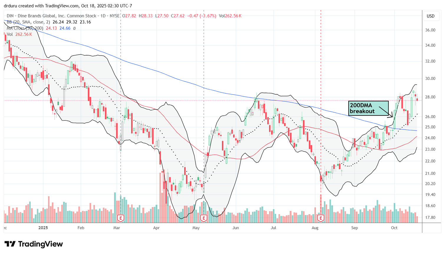 Technical status: DIN achieved a bullish 200DMA breakout and then pulled back to its 20DMA.