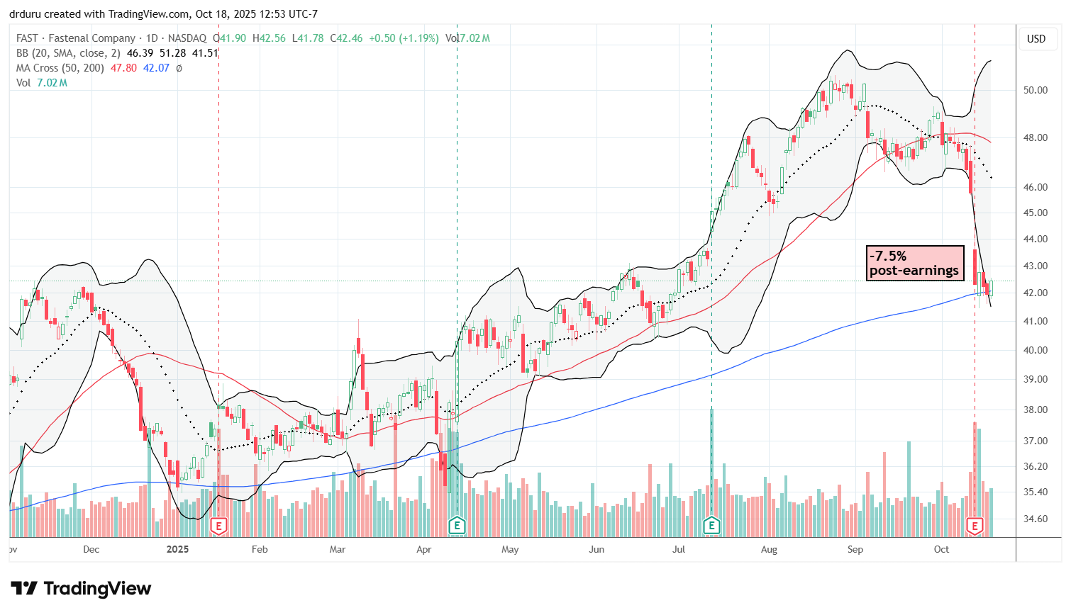 Technical status: FAST fell 7.5% post-earnings and is now clinging to 200DMA support.