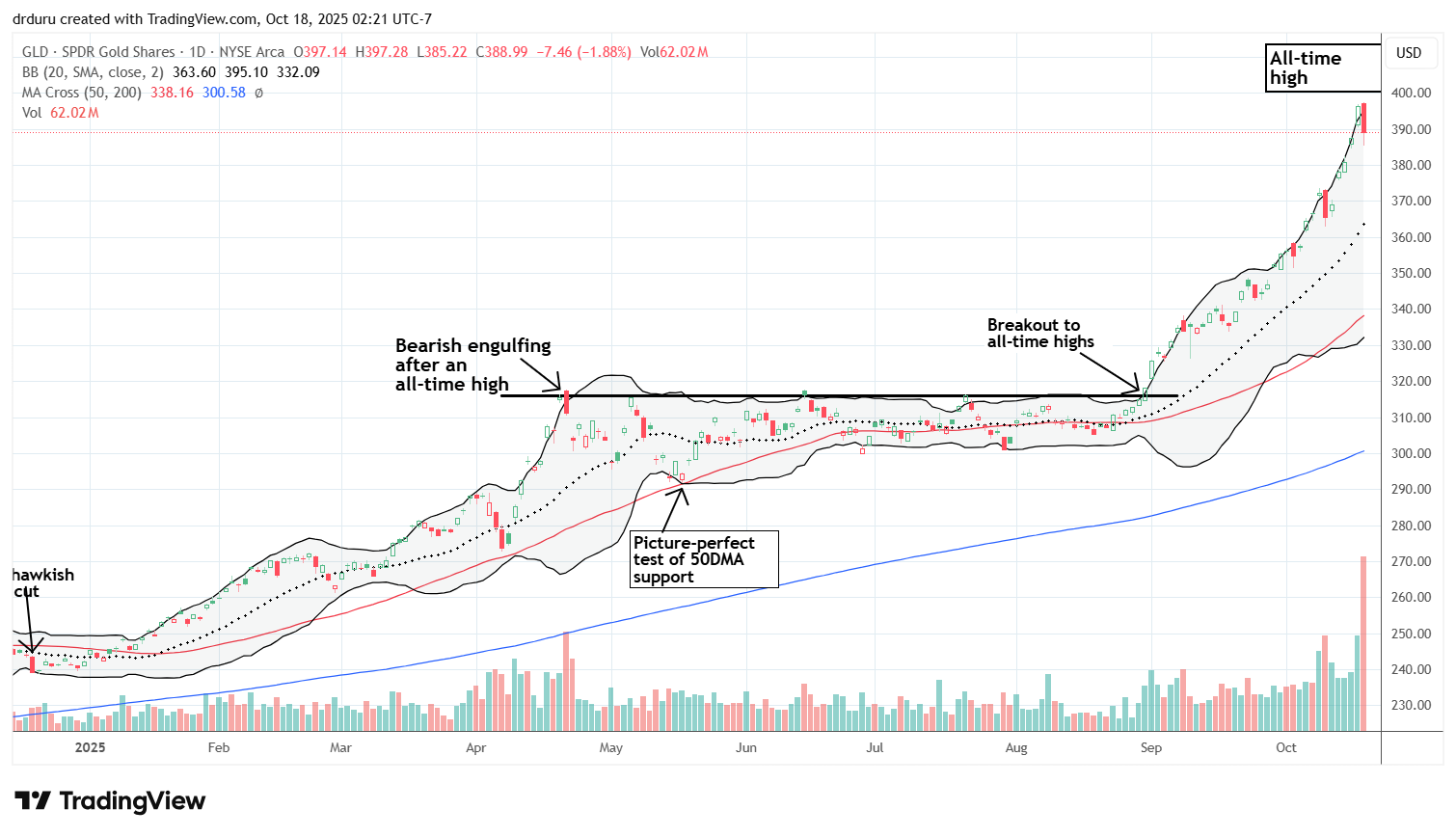 Technical status: On Friday, GLD’s near-parabolic run stalled with a 1.9% drop and record volume, forming a bearish engulfing top.