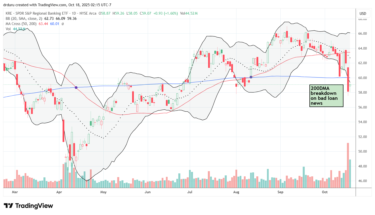 Technical status: KRE is bearish. The ETF of regional banks closed below its 200DMA, after wild swings.