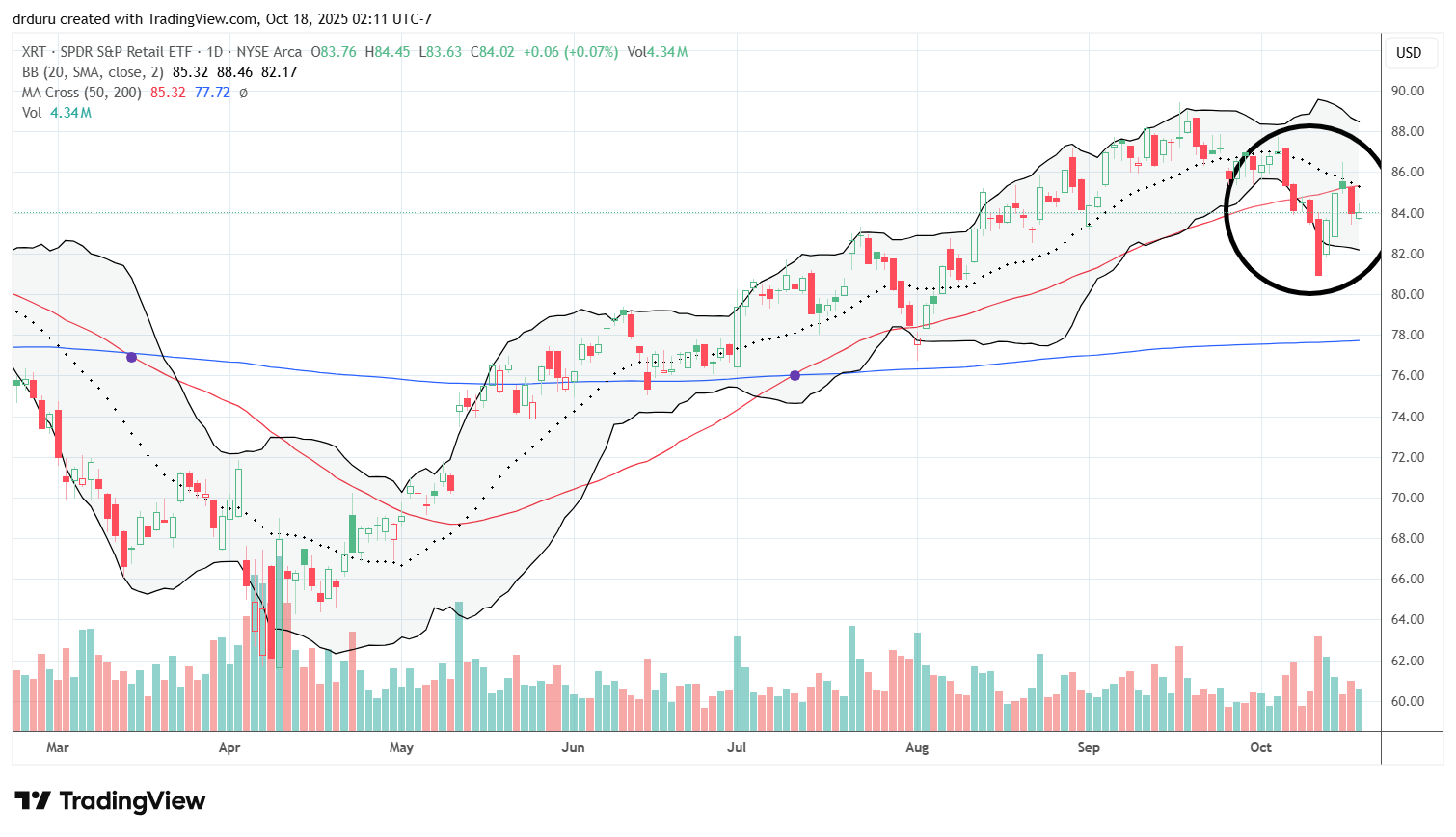 Technical status: SPDR S&P Retail ETF (XRT) confirmed a 50DMA breakdown to a 2+ month low before sharply rebounding. XRT remains bearish with 50DMA resistance holding and a declining 20DMA.