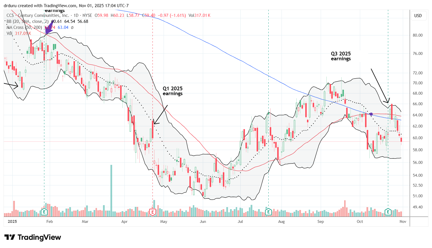 Century Communities (CCS) is one of the few home builders this earnings season to garner an initially positive response to its earnings. Unfortunately, the one day 7.2% post-earnings pop and breakout failed to generate additional momentum. In a sign of the choppy trading ahead for the seasonal strong period for builder stocks, CCS reversed its post-earnings gains in 4 trading days and looks at risk to test recent lows. I recently made a bullish case for CCS and remain positive on the trade.