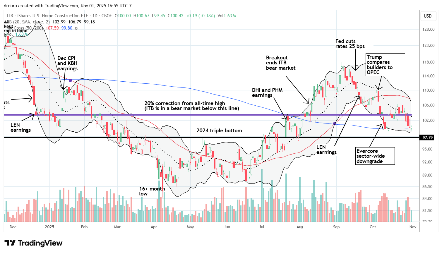 In September, the iShares US Home Construction ETF (ITB) teetered on the edge of a fresh bear market soon after completing a bearish to bullish reversal. In October, accusations of collusion over lot development helped push ITB back into a bear market. A sector-wide downgrade from Evercore appears poised to keep ITB trading near and around the bear market line for some time. A bear market conventionally starts after a 20% decline from an all-time high. Despite the disappointing performance, I treated the fresh declines as a classic entry point to launch the seasonally strong period of trading in the stocks of home builders. (For more details on this year’s strategy see “ITB: Next Seasonal Trade On Homebuilders Starts With A New Bear Market“)