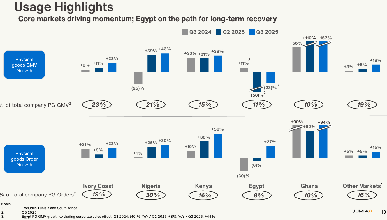 The increased visibility on country-specific market dynamics provides more evidence of Jumia’s confidence in its business. For example, in physical goods, Nigerian orders grew 30% and GMV increased 43% year-over-year. Nigeria now represents 21% of Jumia’s physical goods GMV and 30% of physical goods orders.