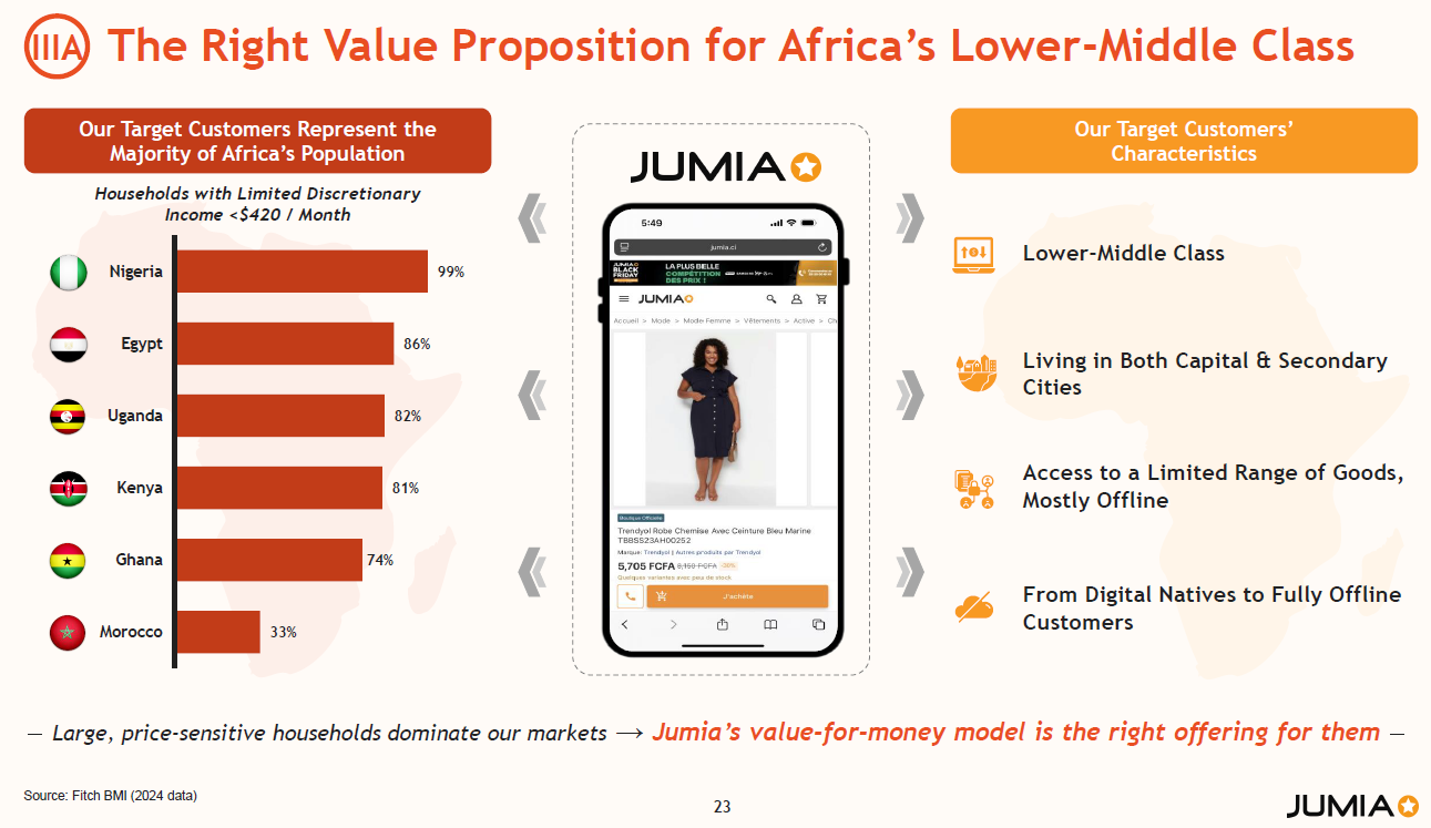 To hit the GMV target, the company needs to maintain the current growth rate over time. This scaling of the business is the core element of the company’s future success. Dufay identified “growth and scaling as the most critical factors for achieving the 2030 guidance”. He also expressed confidence in managing fixed costs and improving efficiencies. The guidance does not incorporate any growth in the annual $2K average GDP per household across Africa or expansion in the discretionary income of Jumia’s target market of lower-middle class consumers (less than $420/month per household – according to Dufay, a data point that was very difficult to estimate from available sources). The slide below from the Investor Day presentation shows that Morocco is the only country where Jumia’s target market is not the majority of the population.