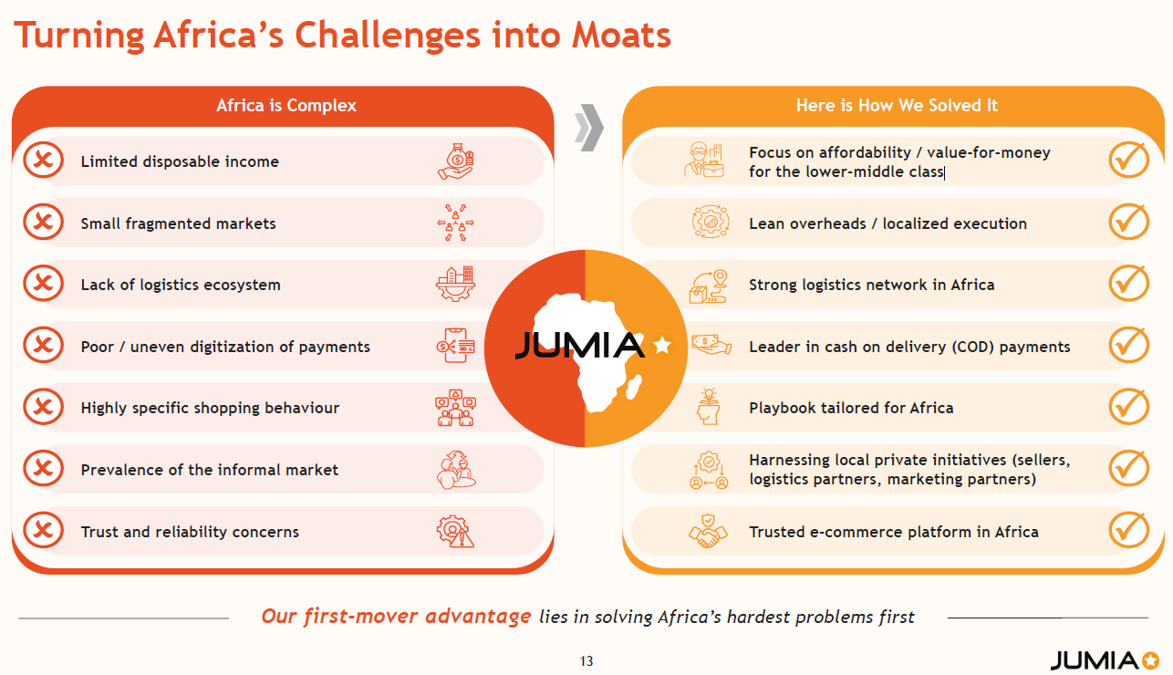 The slide below summarizes Jumia’s competitiveness in the form of transforming the familiar challenges of operating in African markets to Jumia’s unique position in solving and mitigating these challenges.