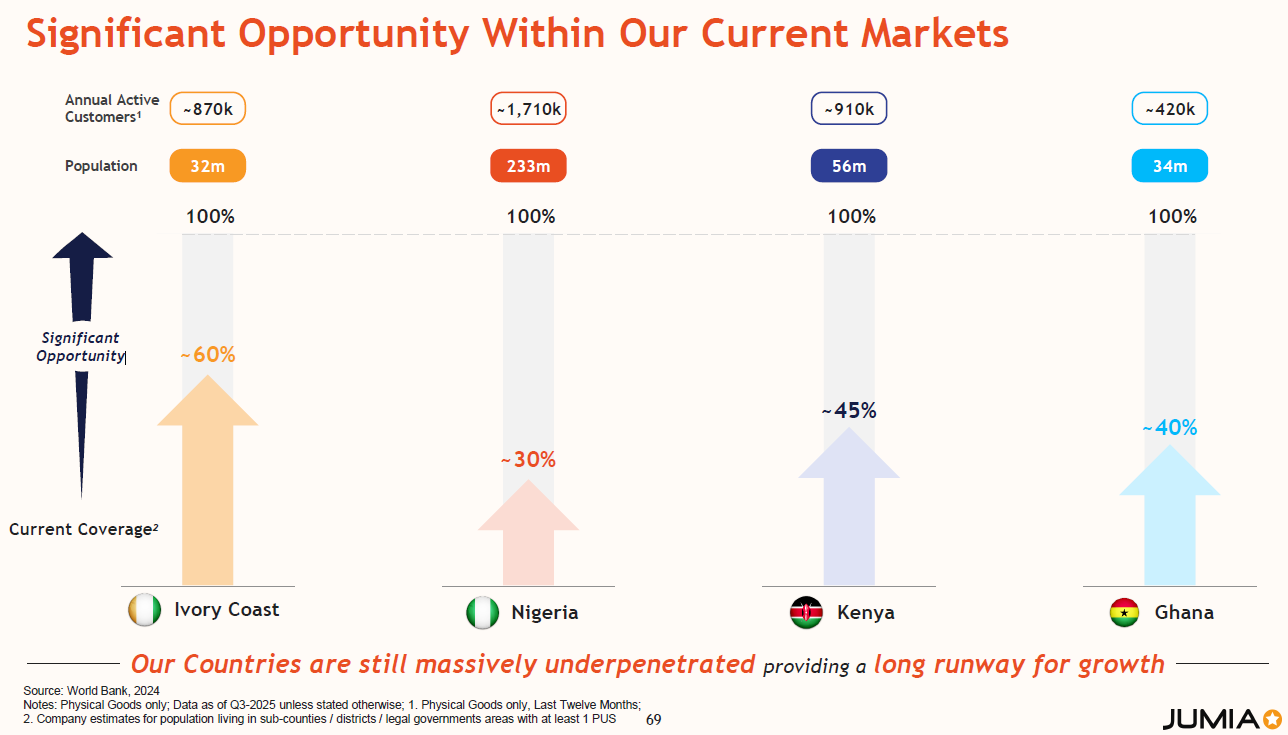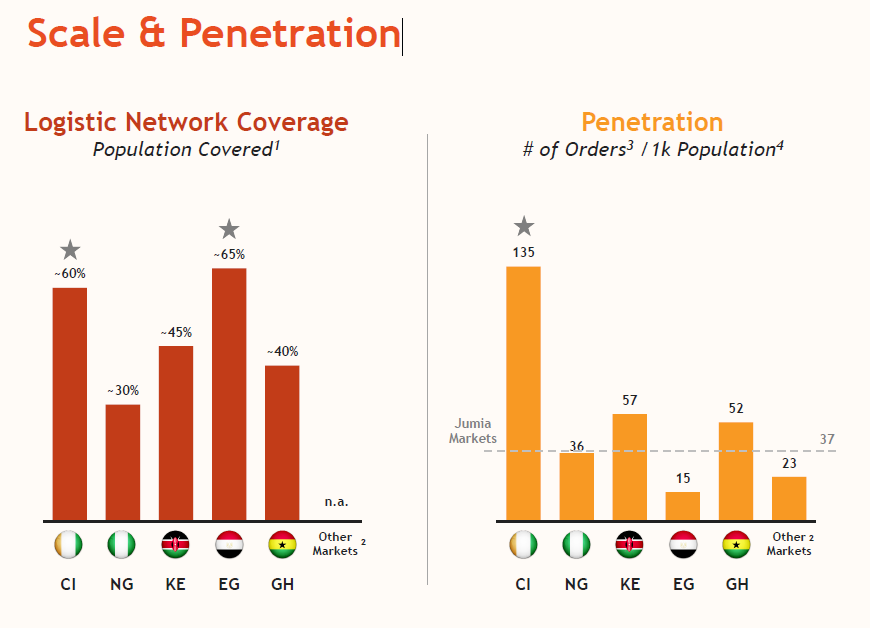 Ahead of any country-level expansion, Jumia still has plenty of opportunity in its existing countries. The charts below quantify the opportunity in terms of current coverage in existing markets and show the country-specific scale and penetration. Jumia described its markets as “massively under-penetrated”.