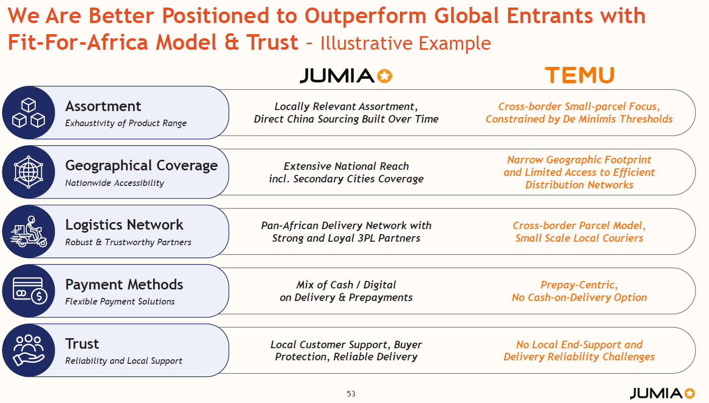 During Investor Day, Temidayo Ojo, CEO of Jumia Nigeria, added that Temu cannot compete on higher valued items. Jumia has built local supply and can ship in a timely fashion. Moreover, the company has heavily invested in its supply chain and as a result can match Temu on price and even deliver items like fashion faster than Temu. Still, Jumia views competition positively; market pressure keeps the company “on its toes”.