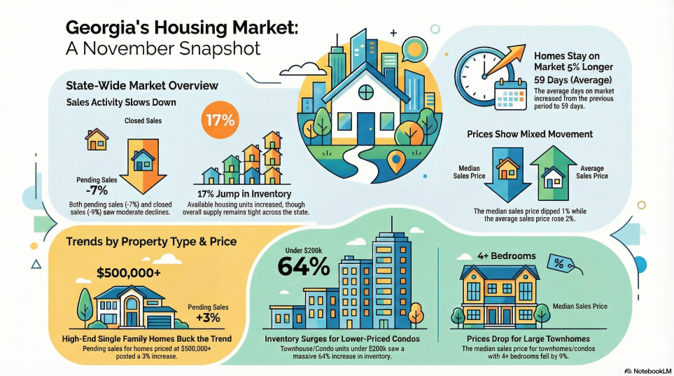 The following infographic was created from Notebook LLM based on the November Georgia housing data posted by the Georgia Association of Realtors.