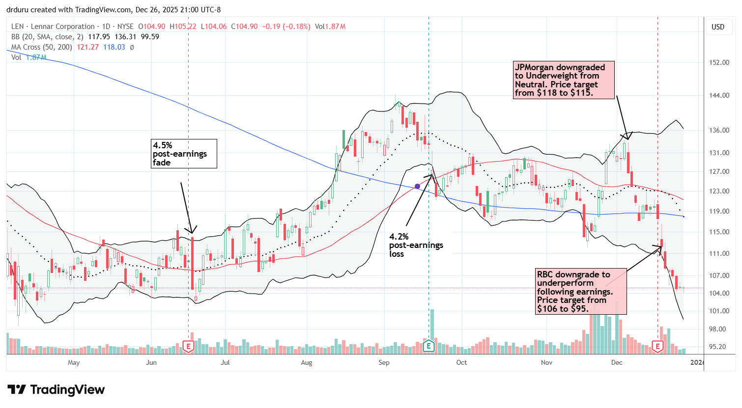 LEN lost 4.5% post-earnings and sellers have barely slowed down since then. RBC downgraded LEN right after earnings citing lasting margin concerns. The accompanying underperform rating and price cut from $106 to $95 is clearly weighing on the stock.