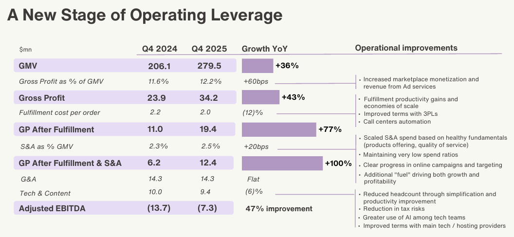 Q4 2025 showed scale expanding margins, fulfillment costs declining, infrastructure supporting higher volumes, macro conditions stabilizing, and a balance sheet not dependent on new capital. As Dufay summarized, “We believe we are in the right markets, at the right time, and finally with the right product-market fit.”