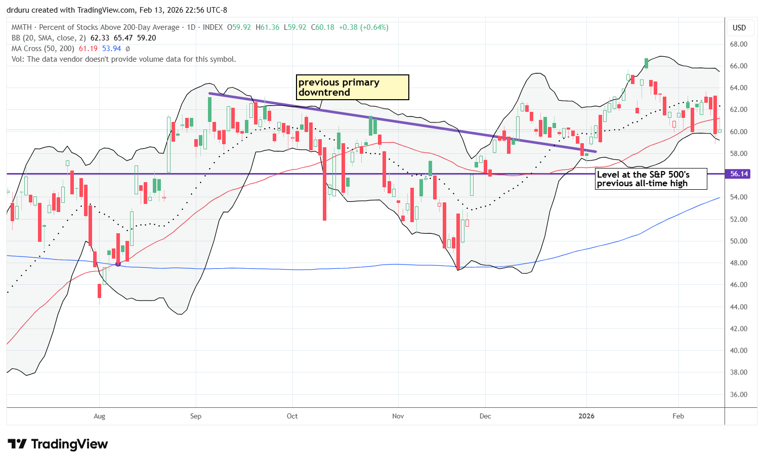 AT200, the percentage of stocks trading above their 200DMAs, has now started to erode. I previously took solace in AT200’s ability to levitate above the previous primary downtrend and above the horizontal line that marks the level at the S&P 500’s previous all-time high back in 2025. AT200 remains in this zone but looks “tired.” AT200 closed the week at 60.2%, down from the 66% cycle high.