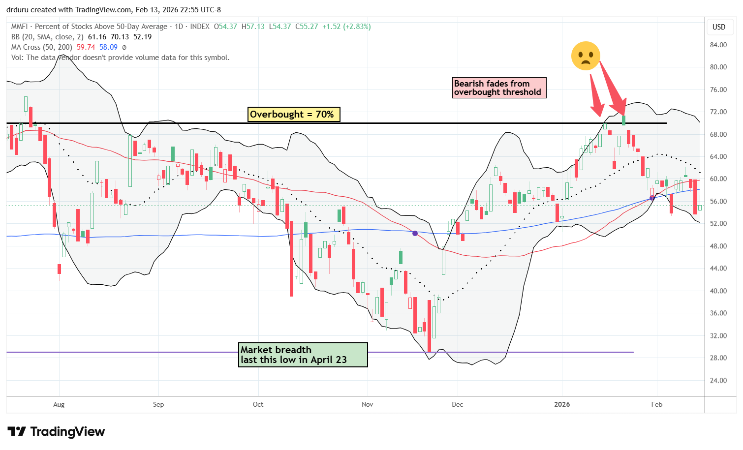 - AT50 (MMFI) = 55.3% of stocks are trading above their respective 50-day moving averages