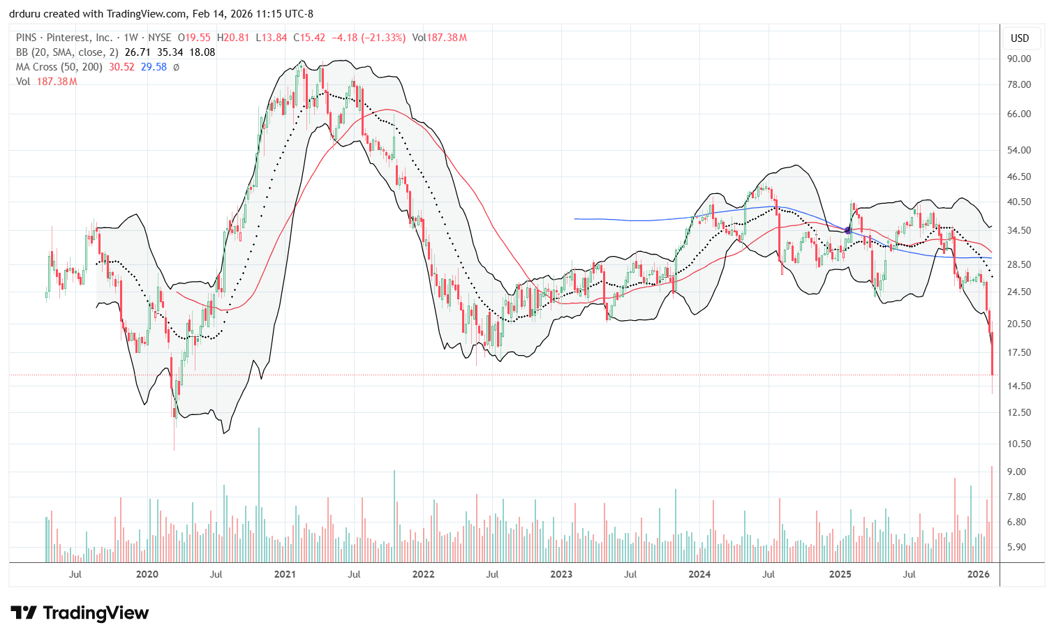 Technical status: Pinterest (PINS) collapsed 16.8% post-earnings and returned to levels near early pandemic-era trading. The stock broke down from a long consolidation period.
