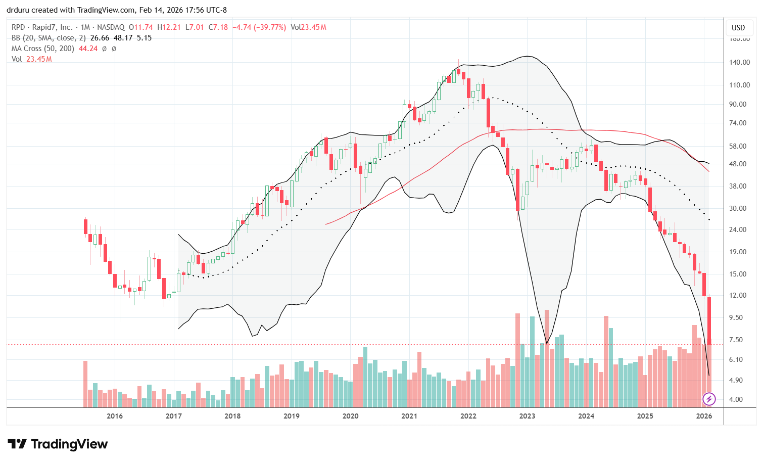 Technical status: Rapid7 (RPD) crashed to an all-time low after a 29.0% post-earnings plunge as part of an on-going, severe downtrend.