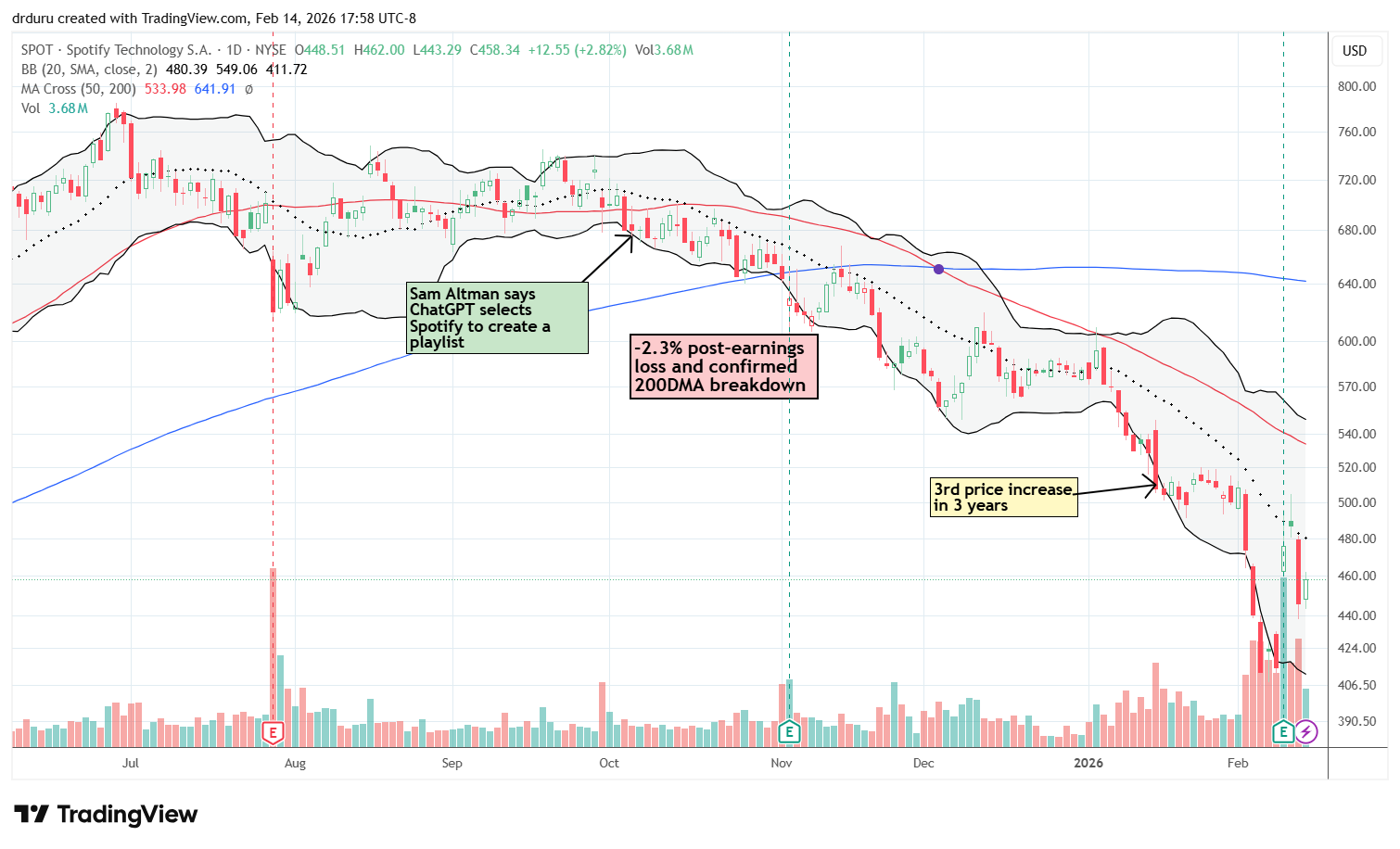 Trade commentary: Bearish technical signals took me out of SPOT back in November. The stock has trended downward ever since. That downtrend remains in place with 20DMA resistance despite the impressive post-earnings bounce. The stock remains a no-touch for me until some kind of stabilization/consolidation creates a tradeable low.