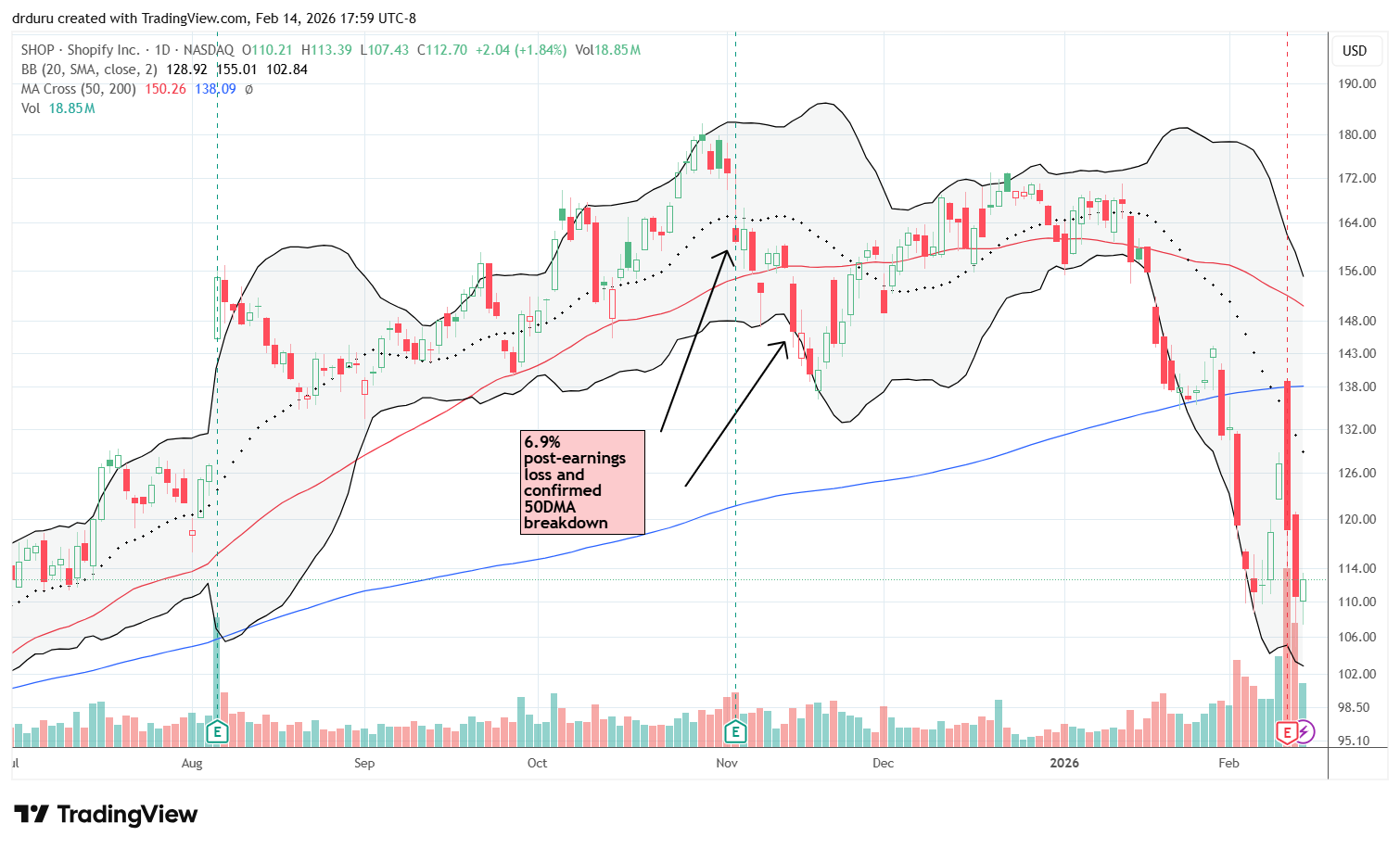 Technical status: Shopify (SHOP) broke below its 200DMA and traded in bearish territory with chaotic price action including a post-earnings fade from 200DMA resistance.