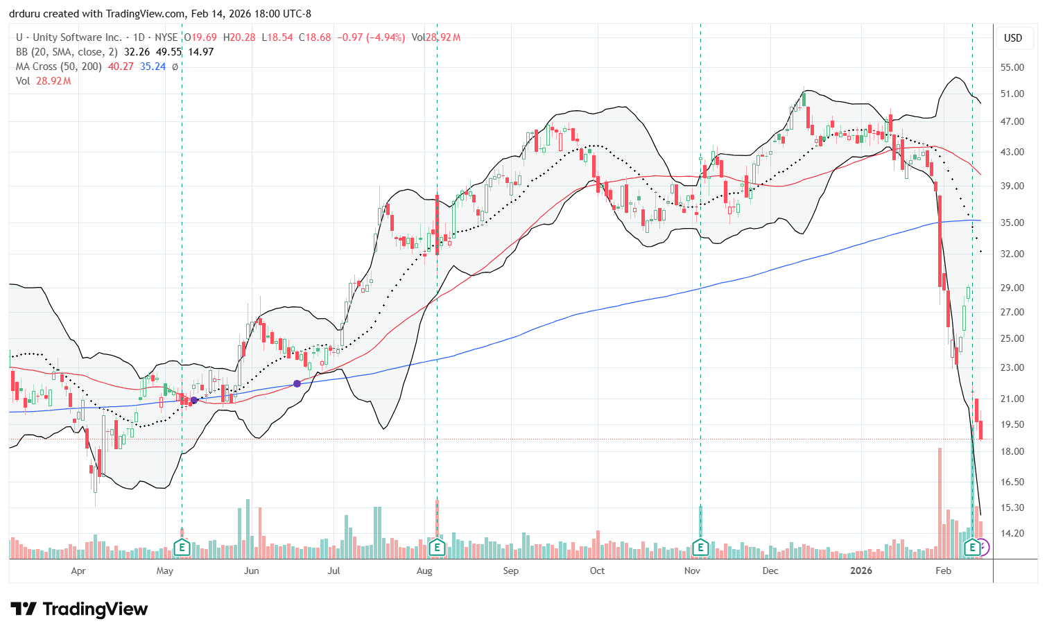 Technical status: Unity Software (U) crashed 26.3% post-earnings, a move exaggerated by a dead-cat bounce going into earnings. Sellers closed U’s week at levels last seen in April.