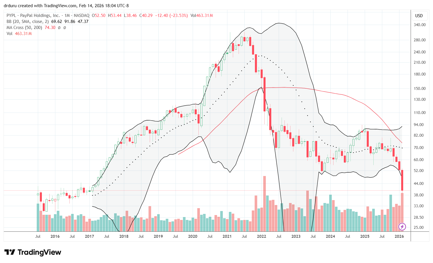 Trade commentary: The demise of PayPal’s stock has been long in the making. Along the way, I have had several cases arguing the stock is a bargain. The stock looked like it was consolidating from 2022 to 2025. Bullish behavior in 2024 fooled me into hanging on further in the stock. I took my lumps last year and apparently just in time. This year has been a breakdown year for PYPL. The stock is yet another reminder of why investors should not fall in love with individual stocks. PYPL never recovered from the bursting of its pandemic bubble and now looks uninvestible. PayPal is losing a battle among fintechs.