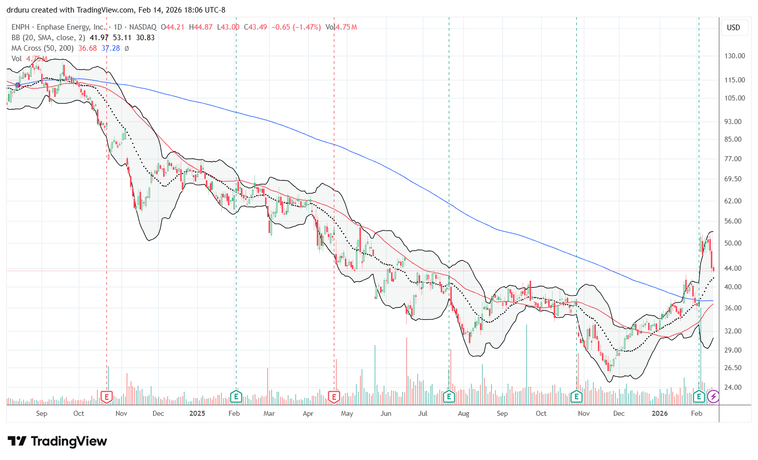 Technical status: Enphase Energy Inc (ENPH) sprung to life earlier this month with a 38.6% post-earnings surge and fresh 200DMA breakout. The stock has lost momentum since then and looks ready to test 20DMA support.