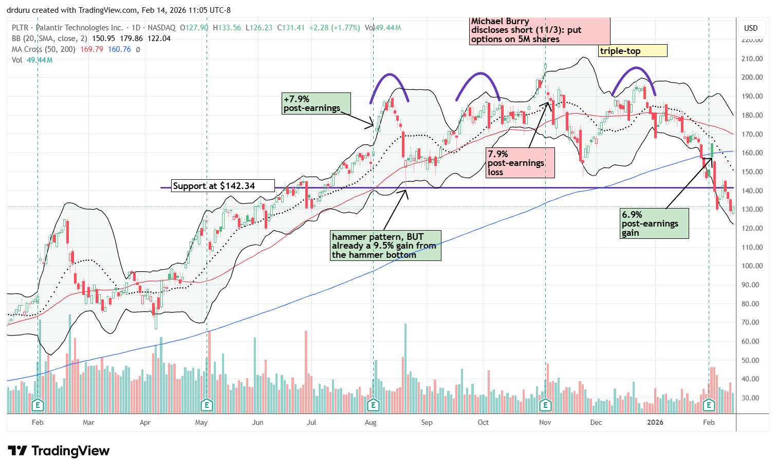 Trade commentary: Palantir sits at the nexus of software and AI; the software portion seems to be taking over the trading action. PLTR failed a critical test at support turned resistance at $142.34. Given the high valuation, only the will of the buyers stands in the way of much lower prices from here. Just based on the technicals, I cannot even start to think about buying PLTR until a test of last April’s lows around $75. Otherwise, the stock has major work ahead to reestablish its bullish momentum after breaking down from a 7-month trading range.