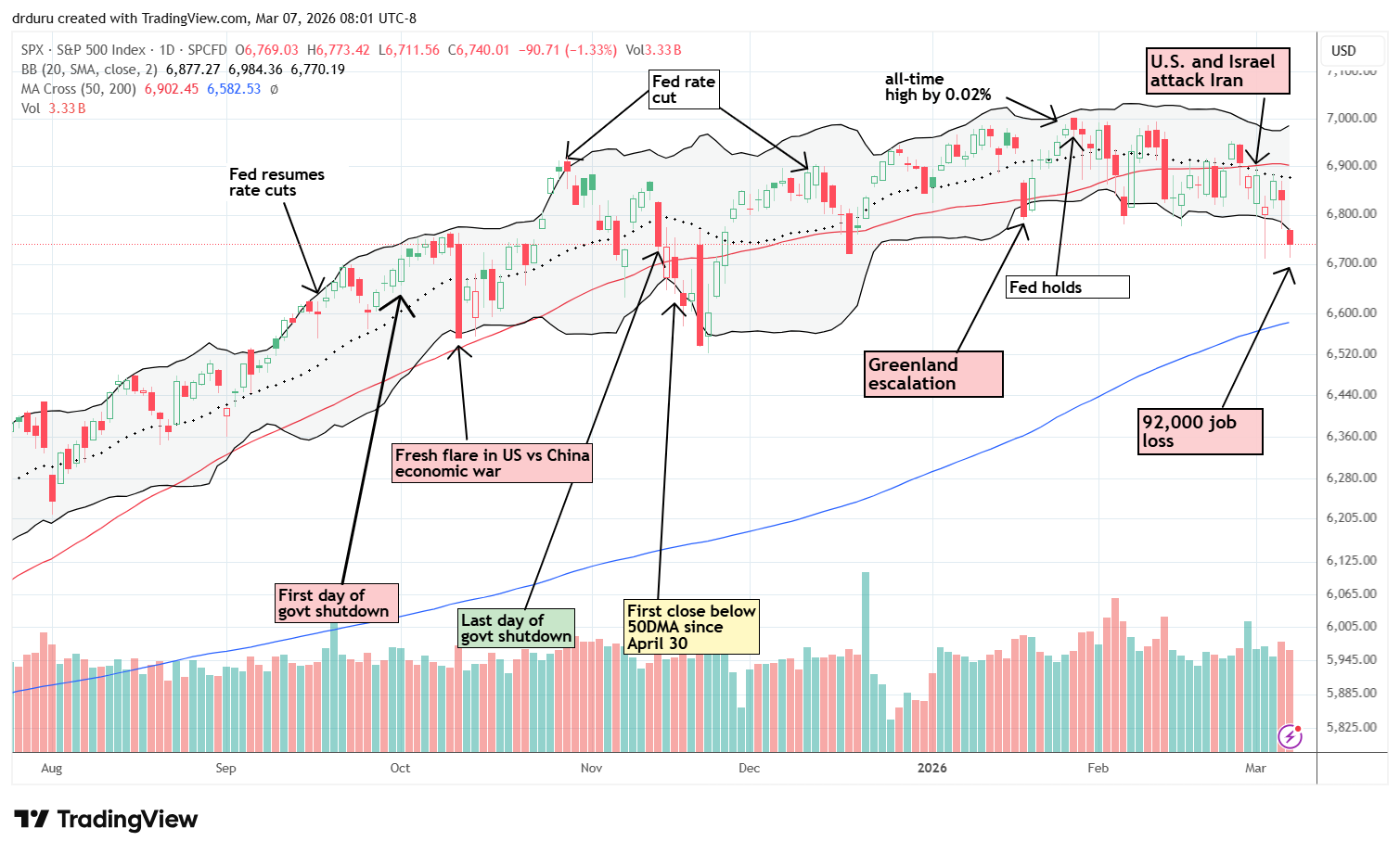 The S&P 500 finally confirmed its breakdown below support at its 50-day moving average (DMA) and is thus firmly bearish. Friday’s 1.3% loss in the wake of a weak jobs report closed the index at a 3-month closing low. However, the recent pattern remains of buyers stepping into the S&P 500 as soon as it drops below the lower Bollinger Band (the black lines enveloping 95% of the price action). So I fully expect a rebound on Monday. The lack of a rebound will tell volumes of just how far market fears have expanded as a result of war, soaring oil, a weakening labor market, and a topping in the AI trade. Regardless, a test of 200DMA support (blue line) is in play.