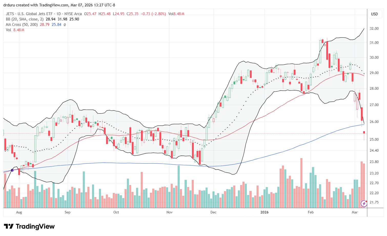 Technical status: Soaring oil prices and war-related travel disruptions sent U.S. Global Jets ETF (JETS) plunging past 200DMA support. This support held in November. JETS is a potential buy above $26.