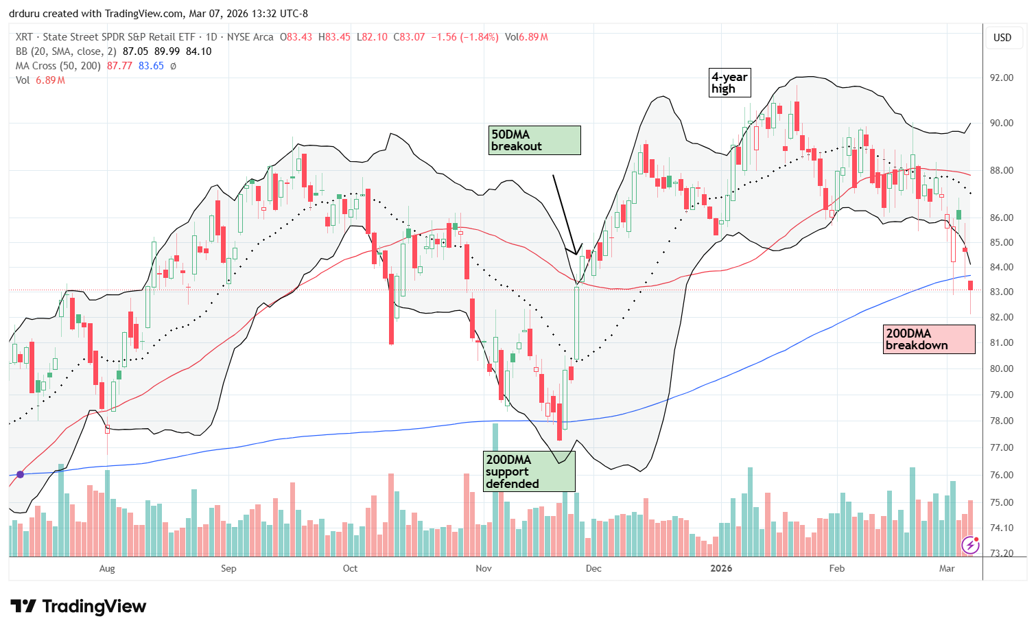 Technical status: A poor jobs report forced the State Street SPDR S&P Retail ETF (XRT) into a 200DMA breakdown.