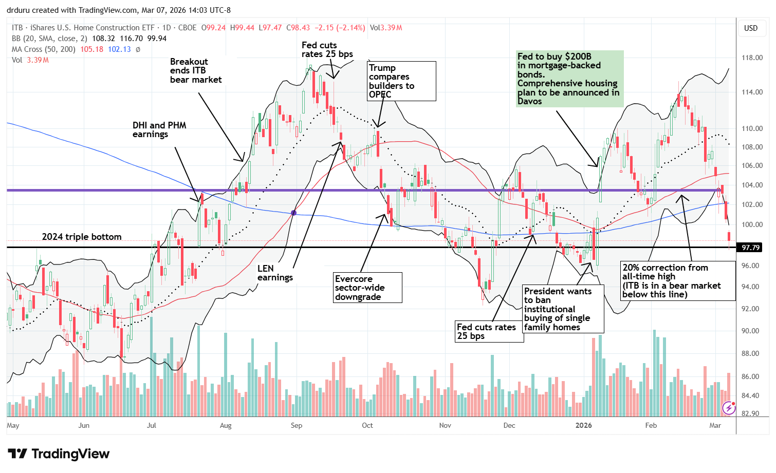 Technical status: Rising interest rates forced iShares U.S. Home Construction ETF (ITB) right back into a bear market, ending the week testing support at its 2024 triple bottom.