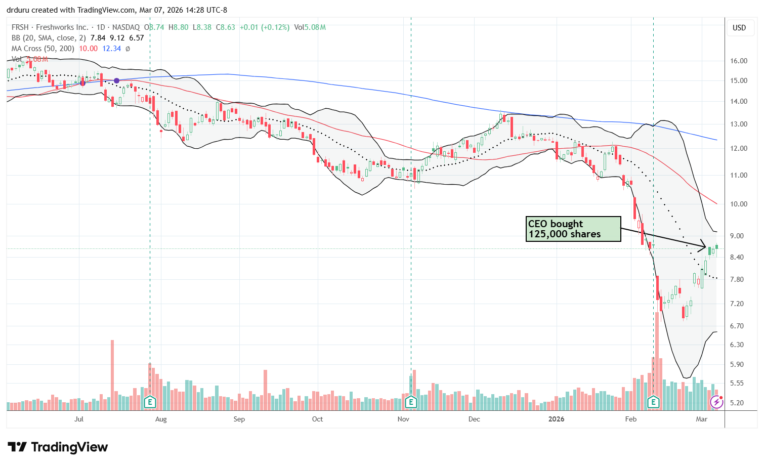 Technical status: Freshworks Inc (FRSH) finished reversing its 16.4% post-earnings loss after news that the company’s CEO bought 125,000 shares.