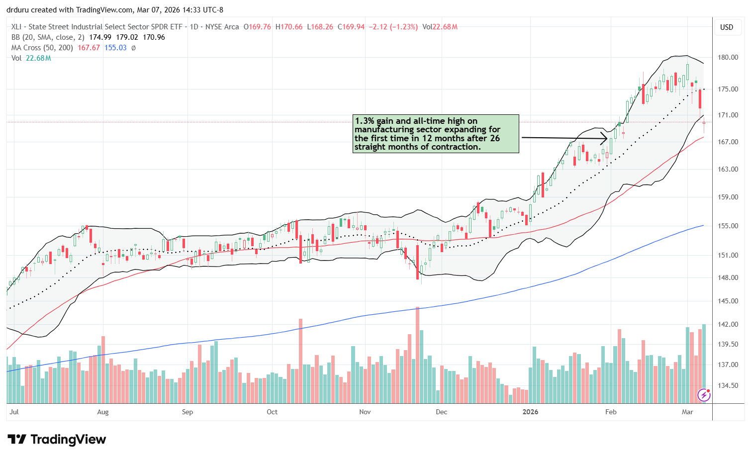 Technical status: The State Street Industrial Select Sector ETF (XLI) dropped sharply after a second breach of 20DMA support. Sellers stopped just short of testing 50DMA support.