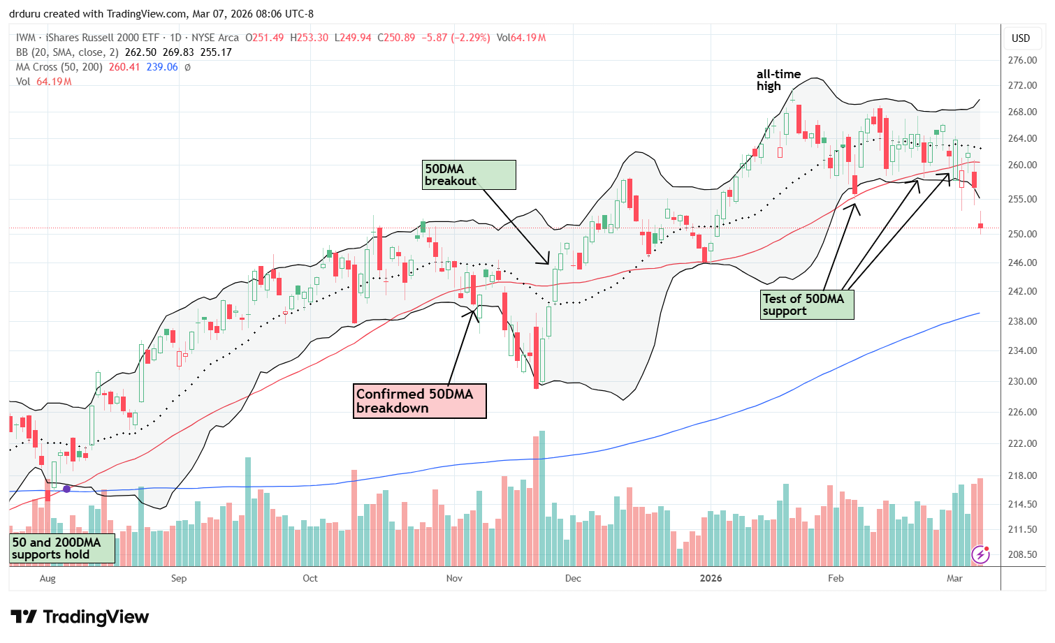The relative outperformance of the IWM came to a crashing end last week. The ETF of small caps confirmed 50DMA resistance and plunged on Friday well below its lower Bollinger Band for a 4.0% loss on the week. IWM is even more over-extended than the S&P 500, so the odds are high for some kind of rebound. Thus, I opened a fresh weekly calendar call trade even after over-confidence ruined my last one; IWM gained 0.9% on Monday and looked even more resilient to the war against Iran than the rest of the market. Now, IWM has joined the other two major indices in bearish trading territory. As a part of risk management, I will likely sell my core shares into the next rebound. I will next look to buy back into IWM at or close to 200DMA support.