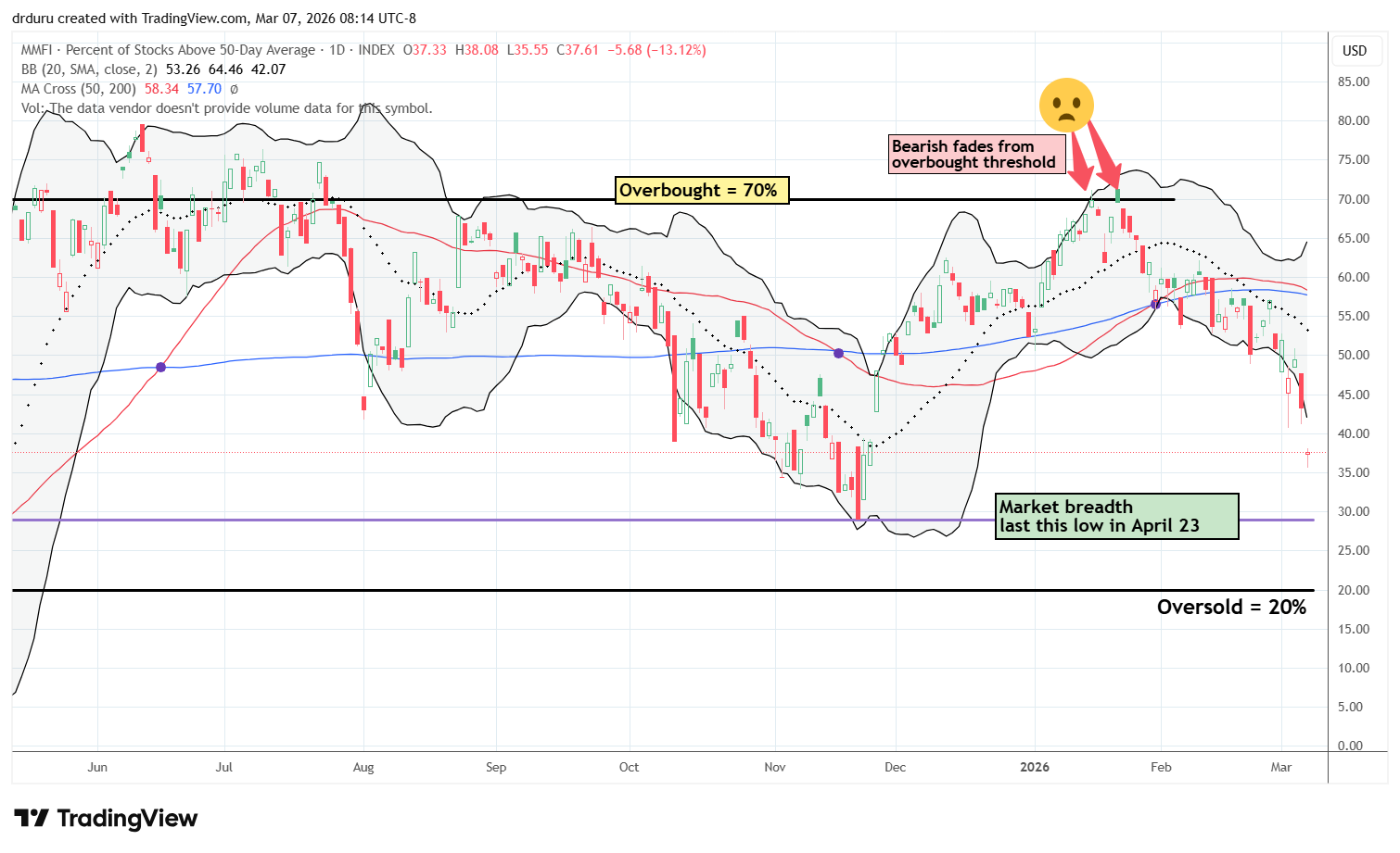 - AT50 (MMFI) = 37.6% of stocks are trading above their respective 50-day moving averages