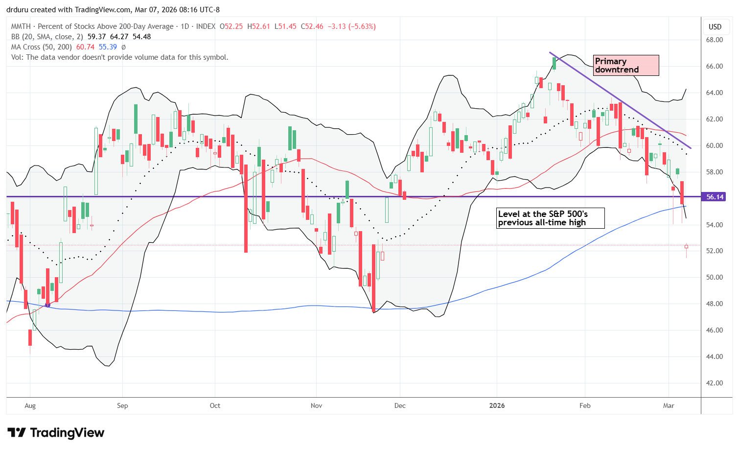 AT200 (MMTH), the percentage of stocks trading above their respective 200DMAs, finally gave way to a bearish trading position. This longer-term indicator of the health of market breadth accelerated losses into a close below previous support at 56.4%. AT200 last traded at current levels in November (see chart at the end of this post).